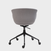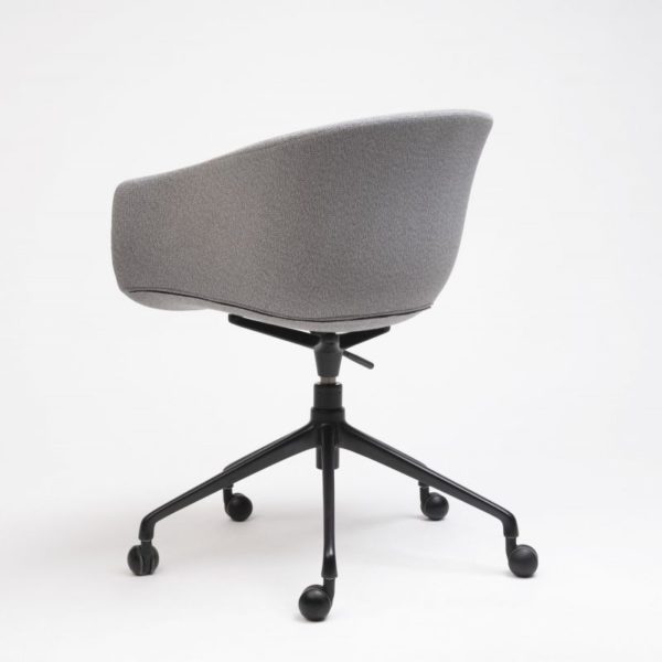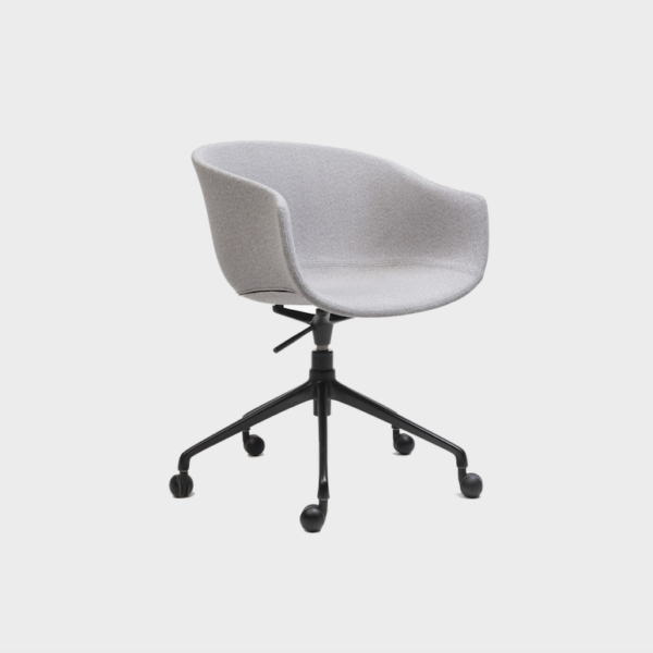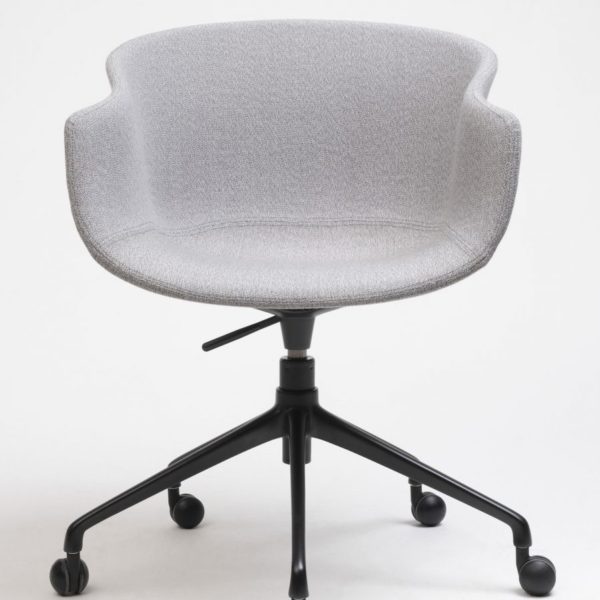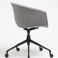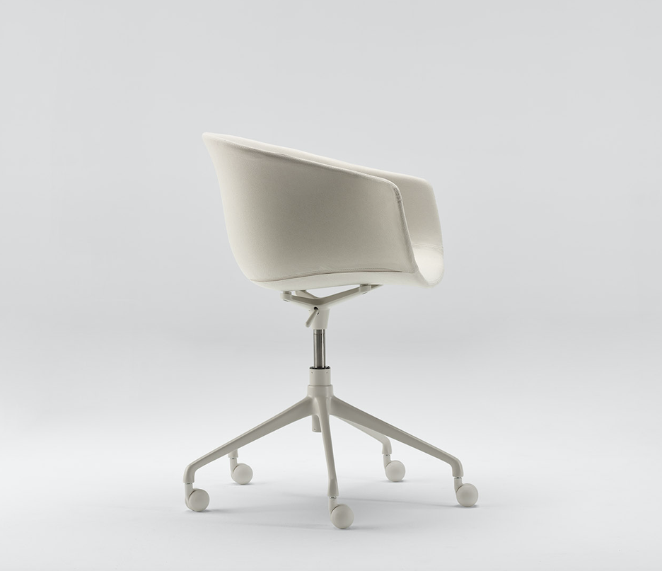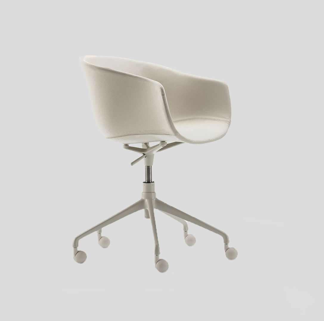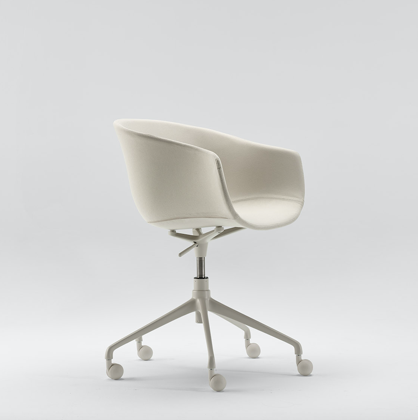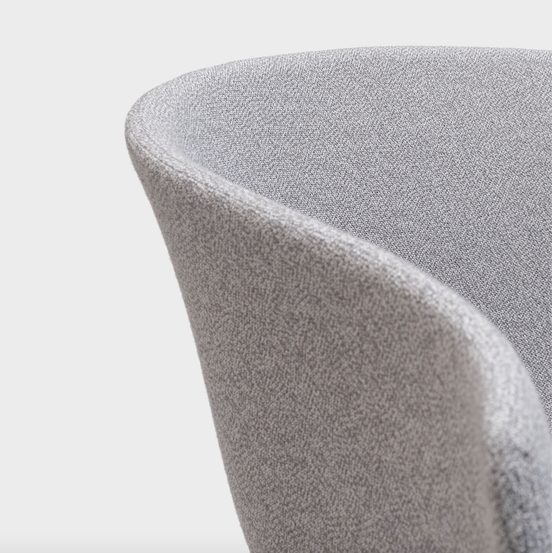 Generous proportions and wraparound lines, a versatile piece that has a noble and welcoming appearance. Its swivel leg frame holds up a soft and organic upholstered seat.