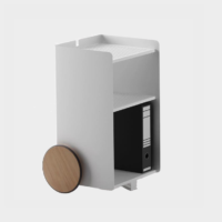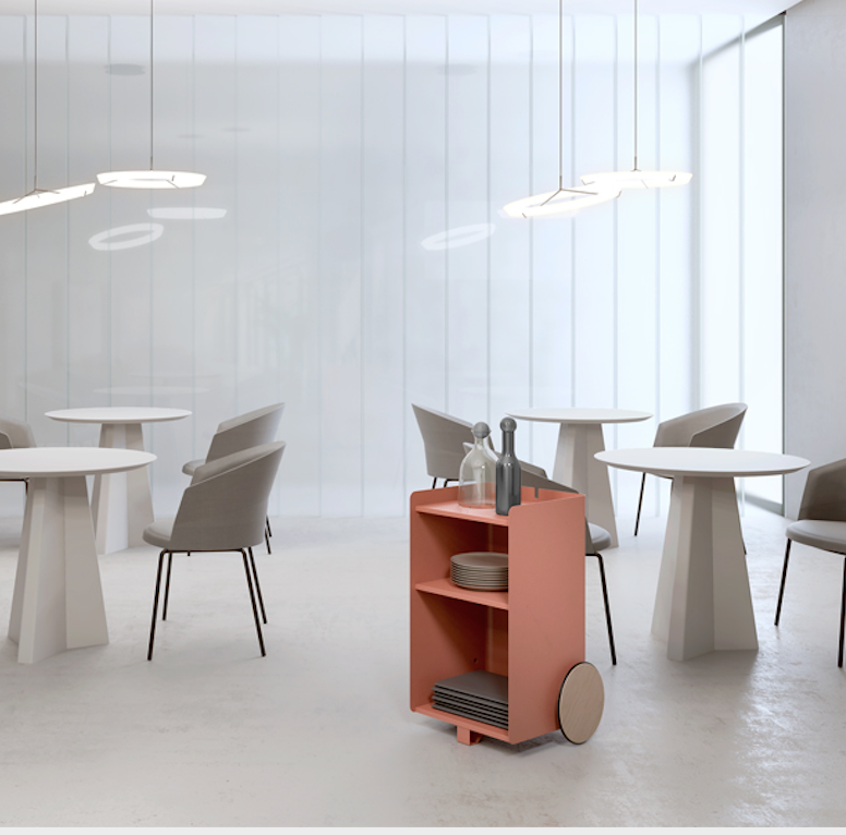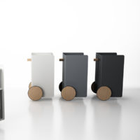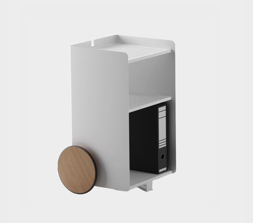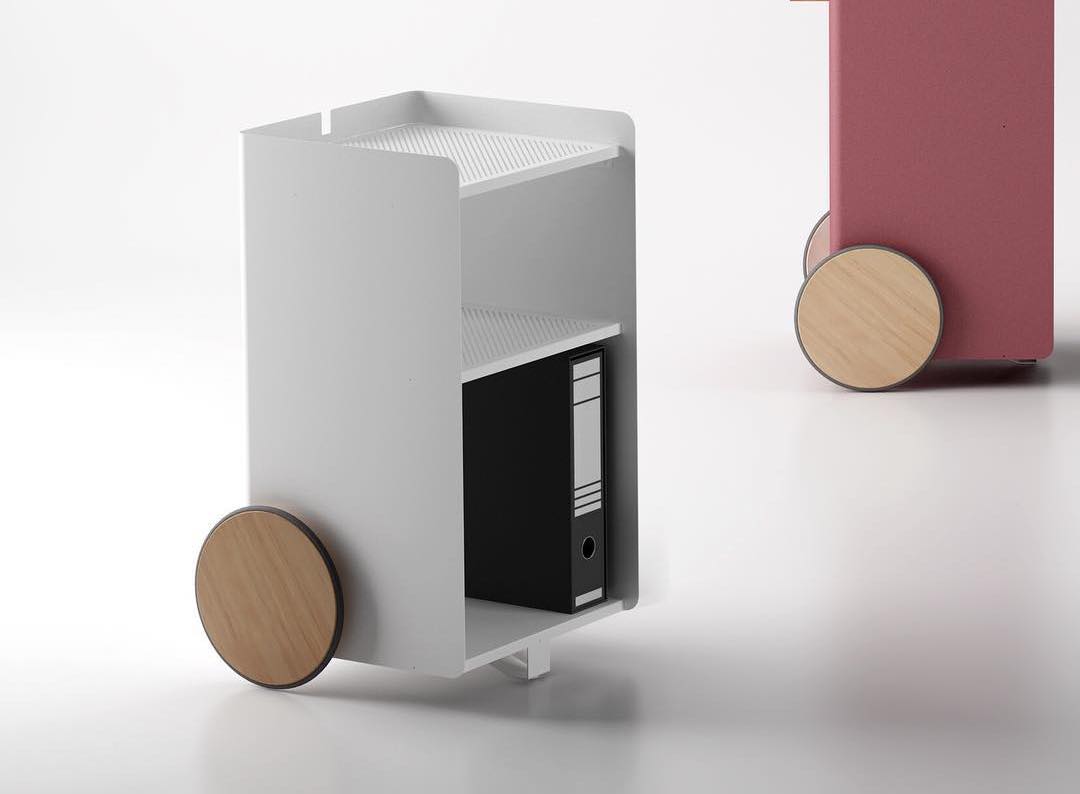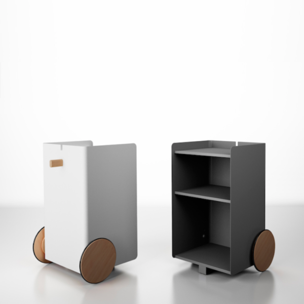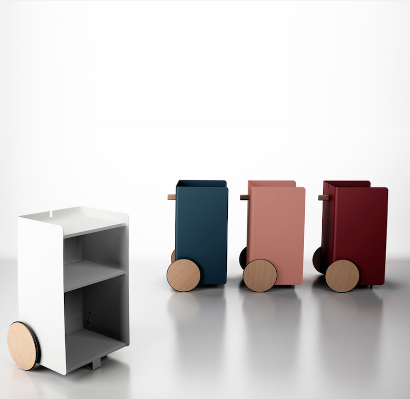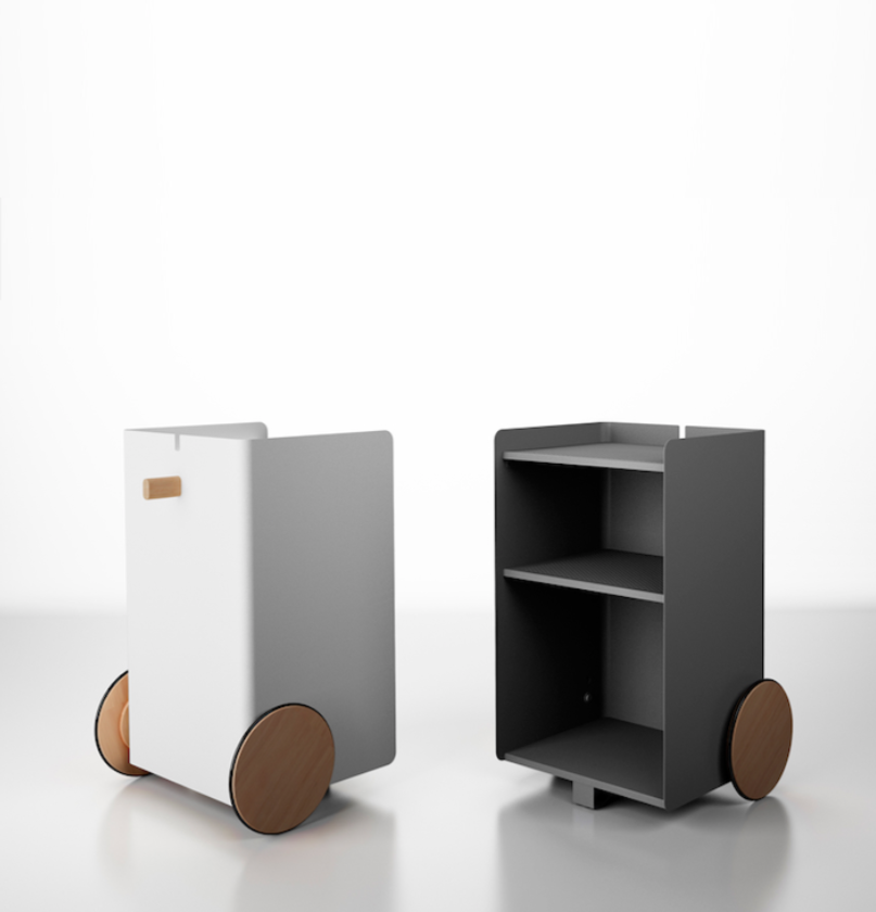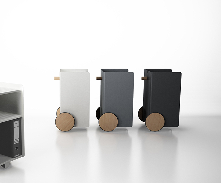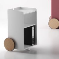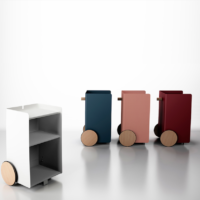 Ben, versatile, compact auxiliary furniture, easy to move. It stands out for the size of its wheels finished in natural oak and its knob made of solid natural oak wood. Manufactured in painted steel finished with thermo-hardened powder paint lacquered in the oven.