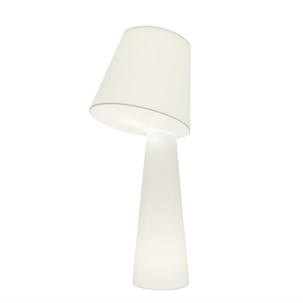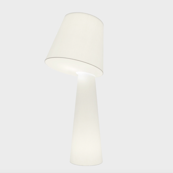 It has a solid internal metallic structure that is covered with an advanced white translucent fabric of polyester fiber. It incorporates light inside the upper shade, as well as in the base, both with E27 lamp holder.