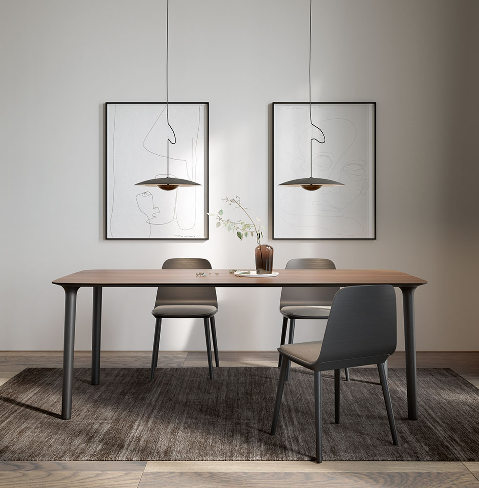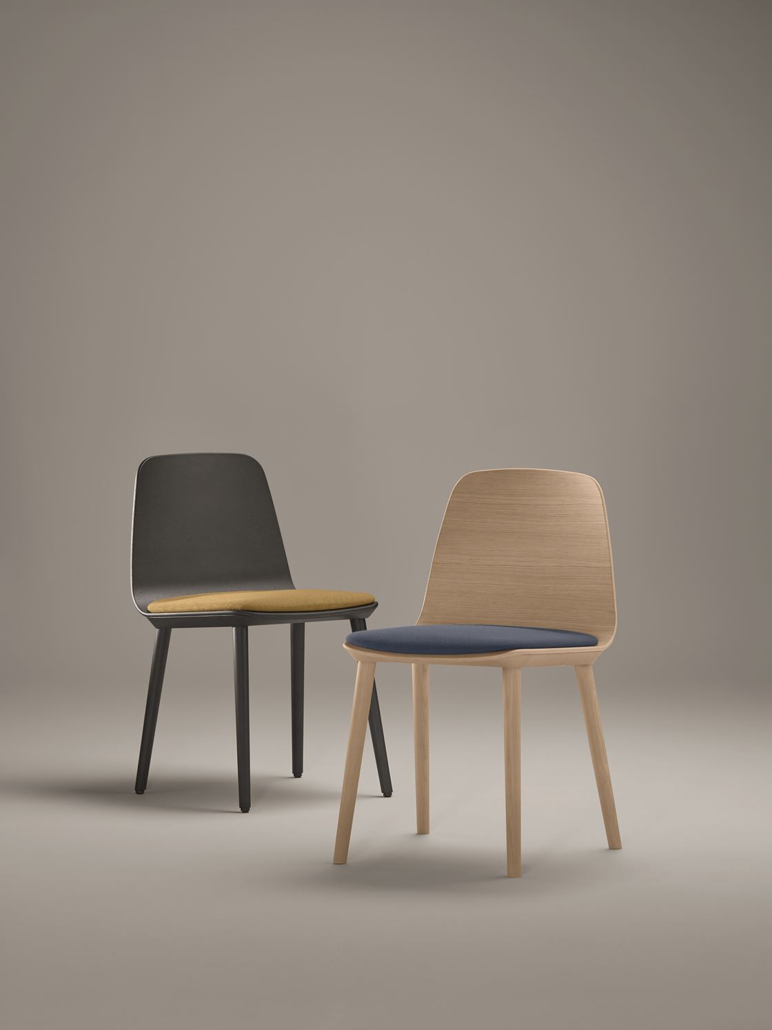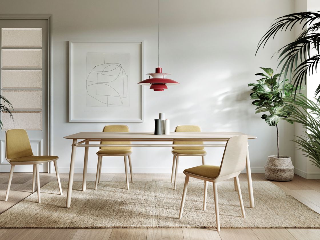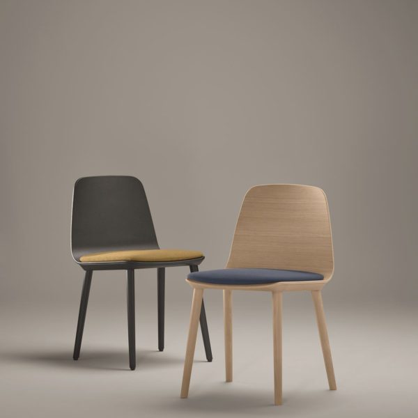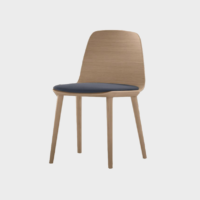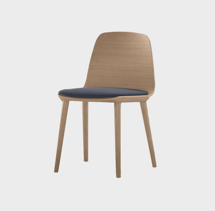 Traditional and modern styles are perfectly balanced in the serene and discreet design of this chair which blends Treku features into warm and intimate settings. Its simple design combines a wooden top, solid wood and upholstery to obtain distinct finishings which, together with different wooden and metal bases, make it suitable for a variety of settings and uses, whether in the home or office.