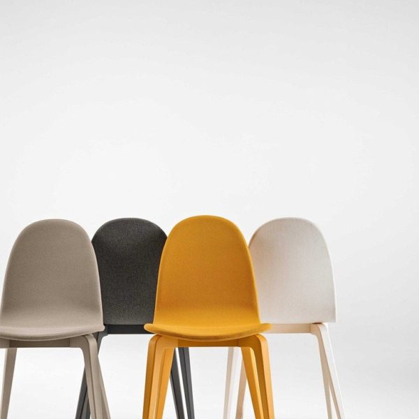 Wooden legs available in stained beech finishes, complete shell upholstery in all fabric finishes. Please specify. Other options like lacquer available upon request.