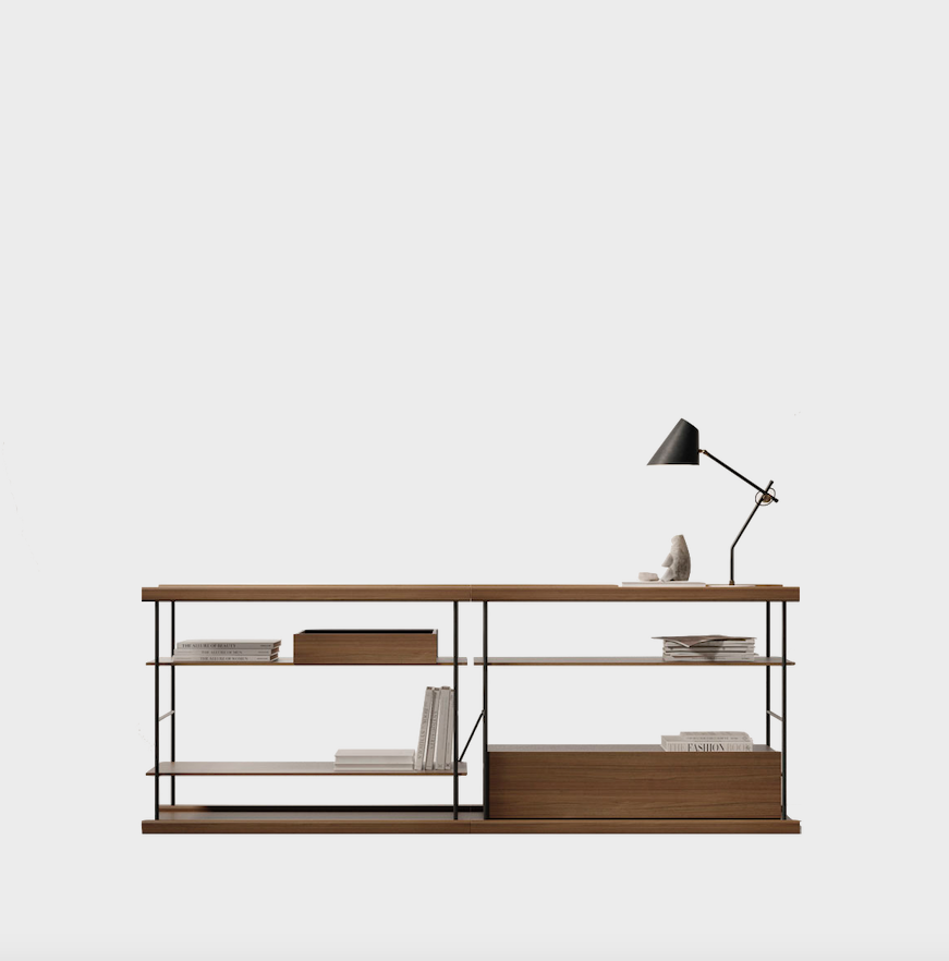 Sideboard with graphite lacquer metal structure, Walnut top, base, shelves and drawer. Includes one module 1100w x 830h mm with two shelves, one open box 480w x 110h mm and one module 1100w x 830h mm with one drawer and one shelf. For more custom options, please contact us.