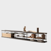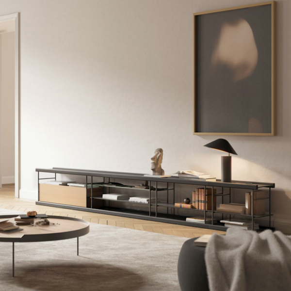 TV unit with graphite lacquer metal structure, Kai black top, base and shelves and Natural oak box. Includes one module 800w x 550h mm with one drawer, one module 1100w x 550h mm with 2 shelves, and two modules 600w x 550h mm with one shelf. Â For more custom options, please contact us.