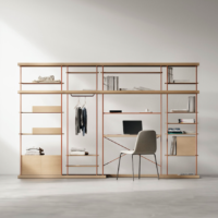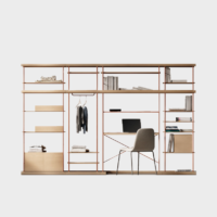 Shelving unit with brick lacquer metal structure and metal shelf, Natural oak top, base, timber shelves and boxes. Includes one module 800w x 1500h mm with one two door module and 2 shelves, one module 600w x 1500h mm with clothes hanging bar and 2 shelves, one module 1100w x 1500h mm with one desk top 570d mm and one metal shelf 1100w mm, one module 600w x 1500h mm with 4 shelves, one stacking unit 800w x 495h mm with one shelf, two stacking units 600w x 495h mm with one shelf, one stacking unit 1100w x 495h mm with one shelf, one two open boxes 480w x 110h mm, and one door unit 320w mm. For more custom options, please contact us.