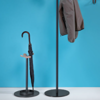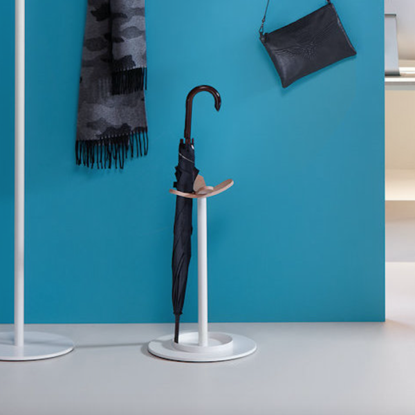 Combining the warmth of wooden hangers with a metal post and base. Umbrella stand also available with a coat stand in different versions. It is ideal for environments where a touch of warmth is sought.