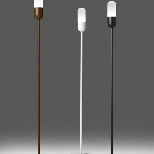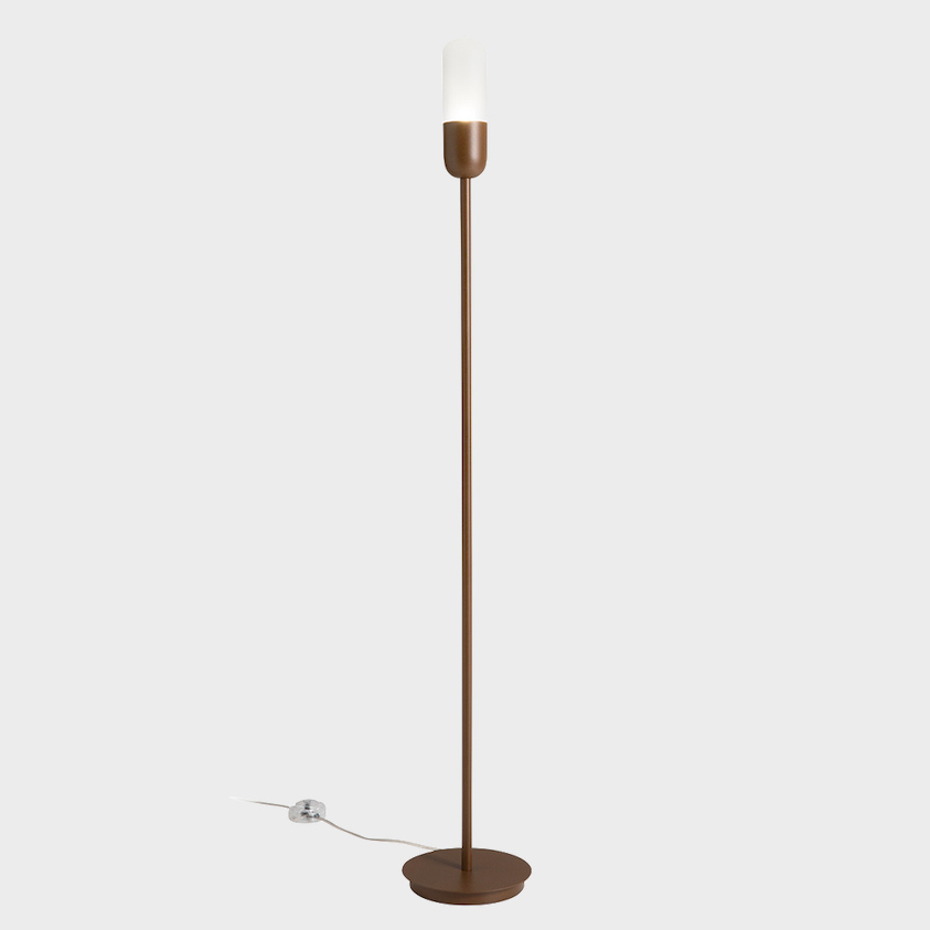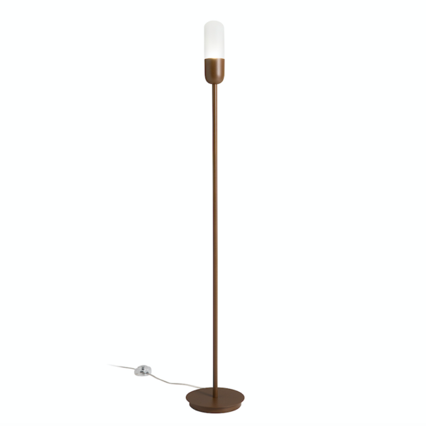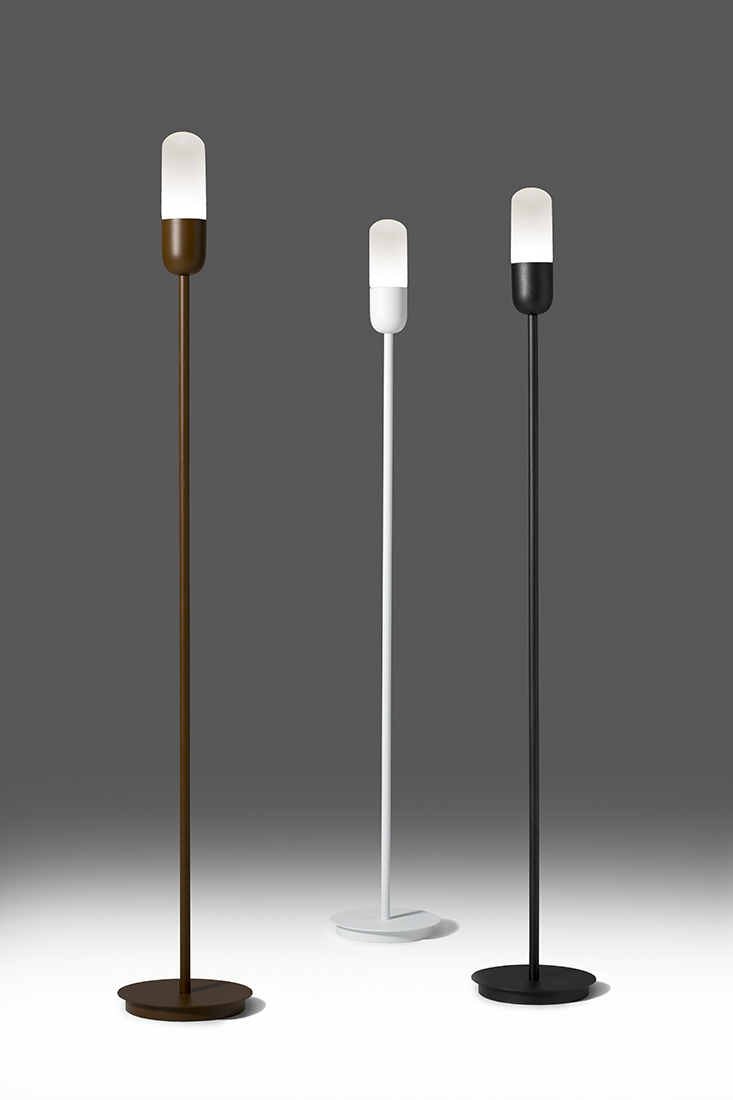 Capsule has three versions: table lamp, floor lamp and hanging lamp. The shade is covered by a sandblasted blown glass. It uses a G9 lamp holder to make it easier for the customer to choose the intensity and tone of light they require, although we recommend using a 5W 3000K and 450lm LED lamp. It comes in three finishes: textured white, anthracite-grey and corten-brown.