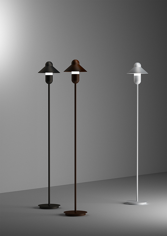 The available versions are table, floor and hanging lamp. The diffuser is made of opal blown sandblasted glass. The structure and the 200 mm diameter shade are made of iron, which comes in three textured finishes: white, anthracite grey and corten brown, in a very contemporary monochrome concept. CapsuleHat includes G9 sockets to facilitate the end user to choose the intensity and tone of light required, although it is recommended to use a 5W 3000K 450lm LED lamp.