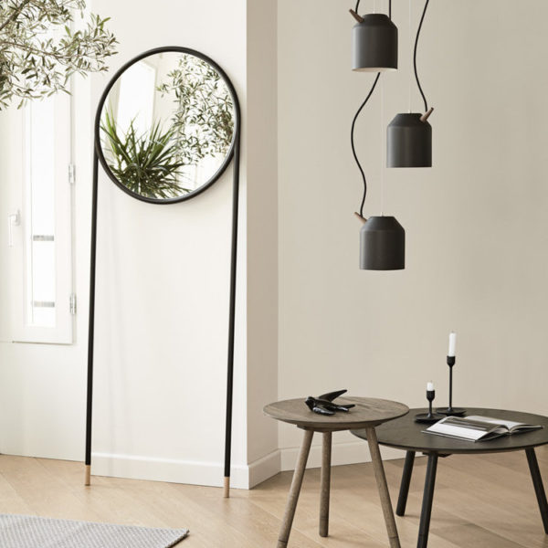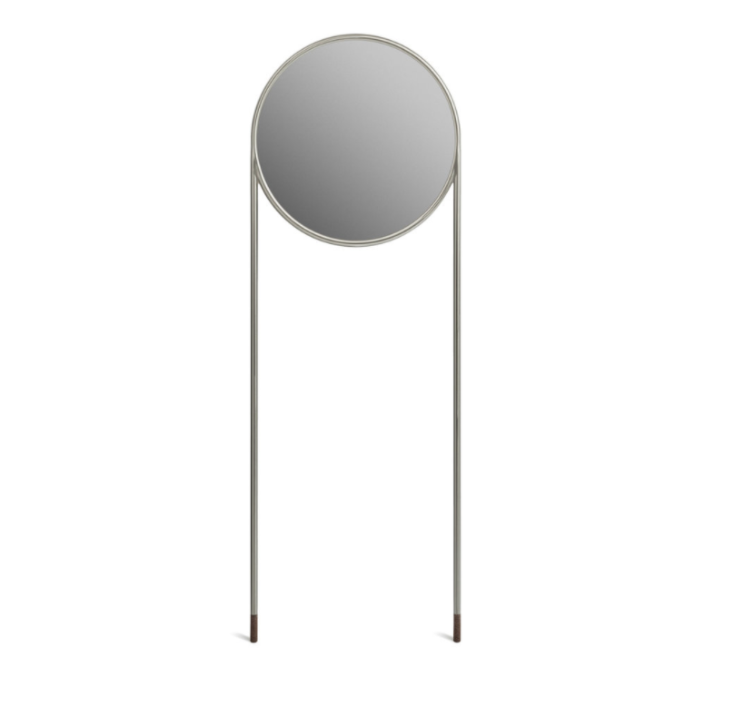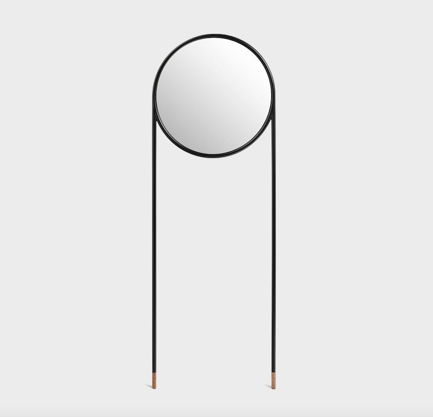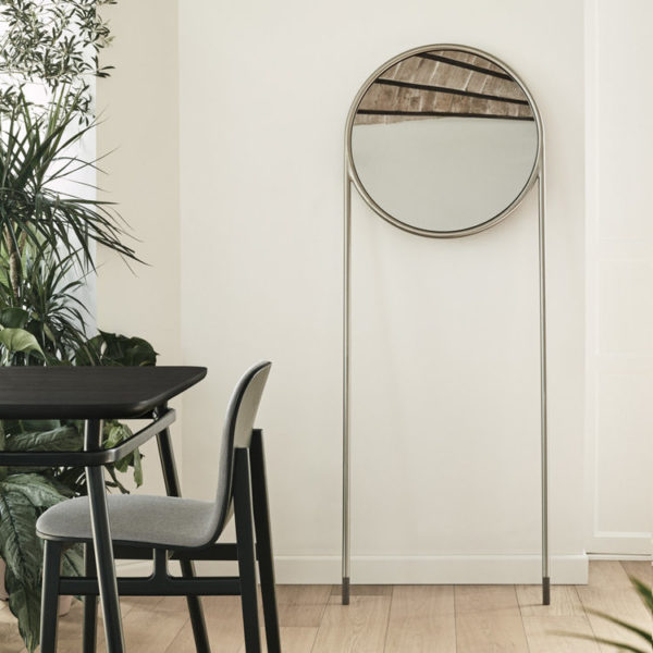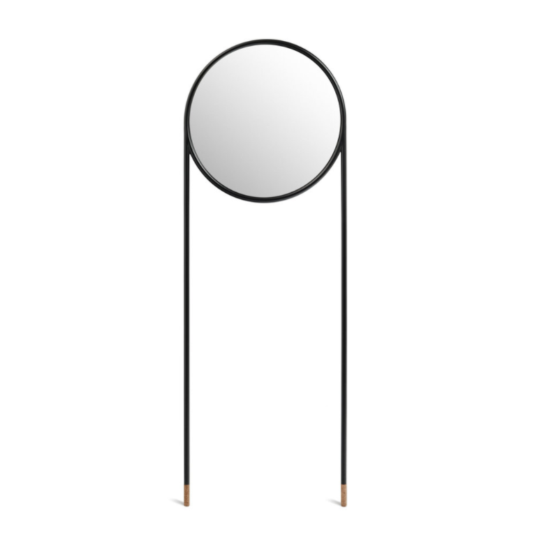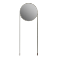 Mirror collection is a collection of wall mirrors in different geometric shapes, both circular and rectangular. The collection has three models of mirrors, a circular mirror with legs, a vertical, rectangular mirror with legs and a circular mirror to hang on the wall. Designed to lean against orbe fixed to the wall, their simple, contemporary lines play with a metal structure finished with two cork feet to prevent slipping.