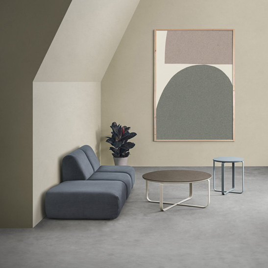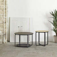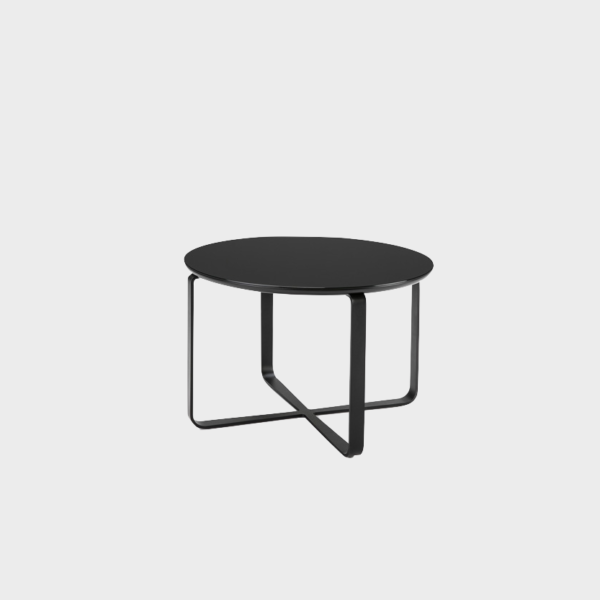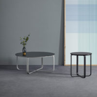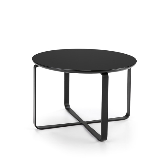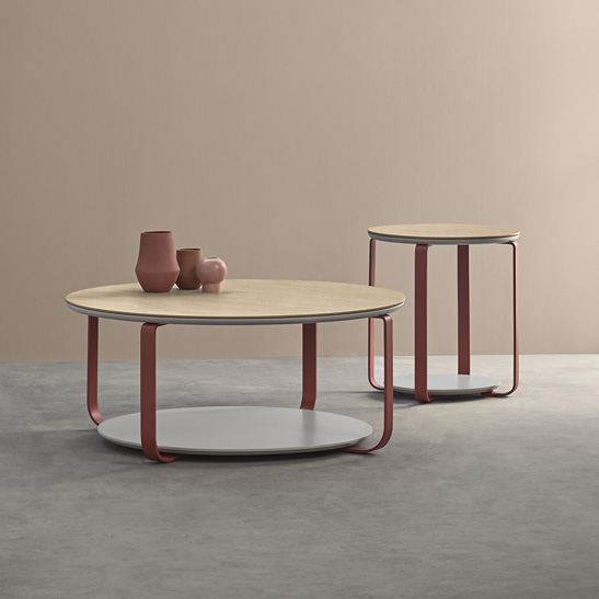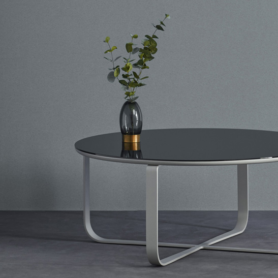 Clik is a system of coffee and side tables of various heights and diameters, for use in contract and residential spaces. The union between its different elements defines its identity: a metal structure of four legs connected in cross and lacquered in epoxy supports the top, available in various materials like oak wood, slate compact, black glass and lacquered wood.