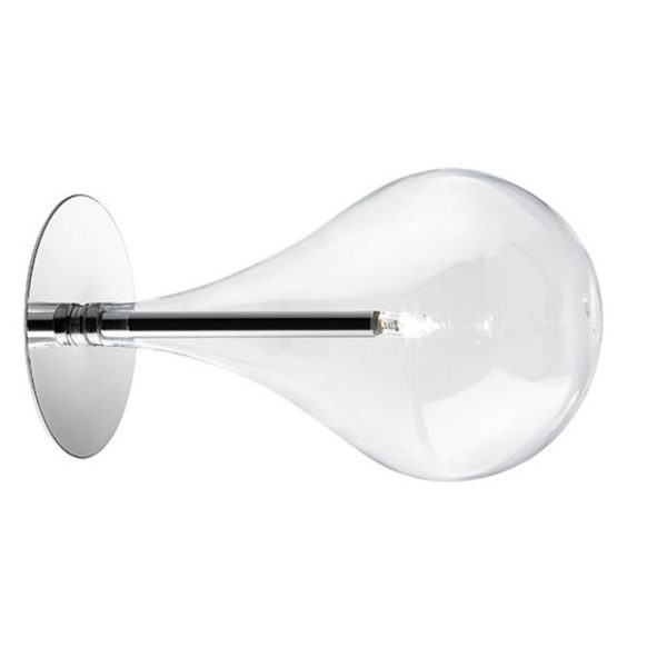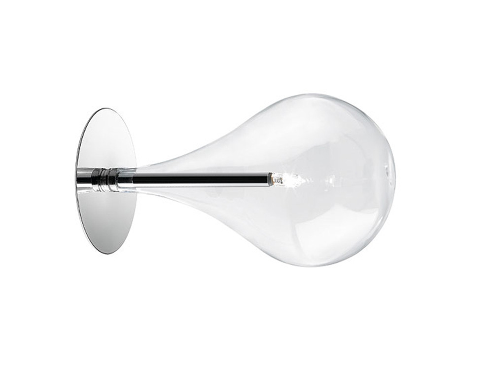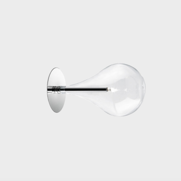 The structure is flat, circular, and made of chromed iron. The shade is borolisicate transparent blown glass and the socket is G4. The LED 1,5W 2700K 110lm bulb (not dimmable) is always included.