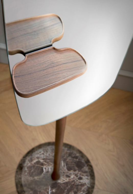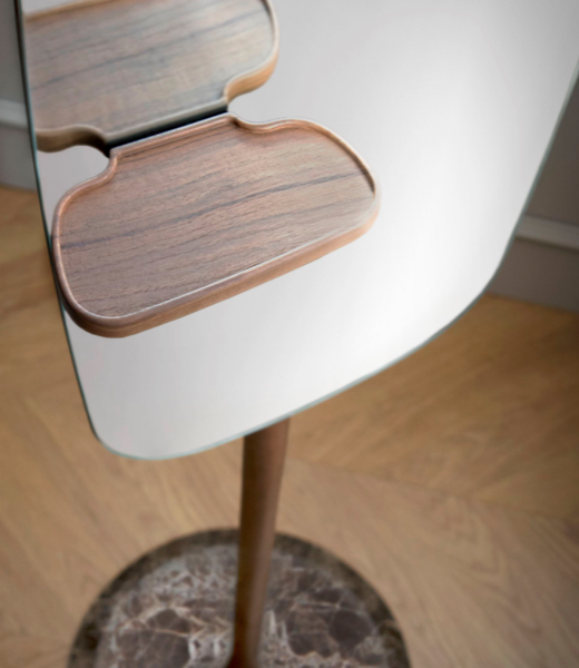 Emperador, Sahara Noir or Calacatta marble base. Structure and accessories in natural solid walnut or stained black ash wood.