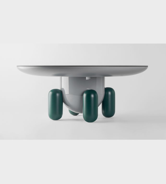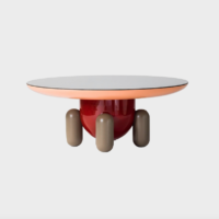 Inspired by the playful and what remind one of jelly-beans, rounded sweets that that children eat in the US, the Explorer side table has at the same time a very elegant beauty which generally is characterised in my designs. Painting some of the parts with a gloss finish and others in matte at the same time, reflective top surfaces and the different combinations of colours give even more richness to the sculptural explorer collection which pretends to be blatantly decorative. Laquered fiberglass body, solid turned wooden legs and lacquered, Â painted glass tabletop.