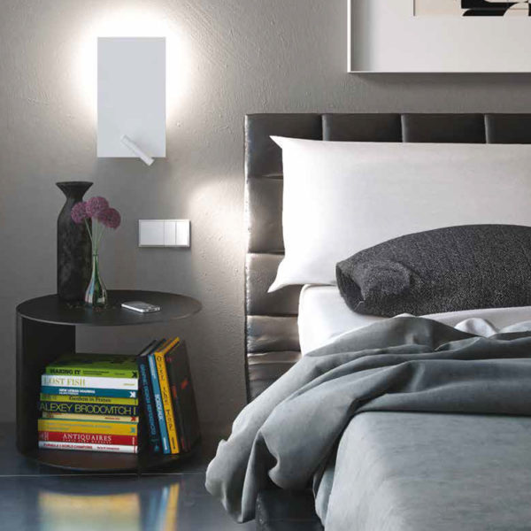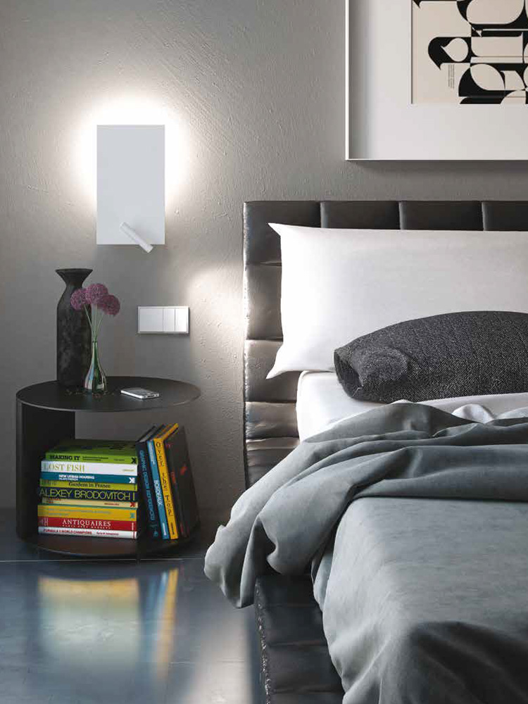 Flat is a happy combination of a metallic rectangle of indirect light that bathes all the space around it, and a LED line integrated in its reading arm, that can be directed to where the user wishes.