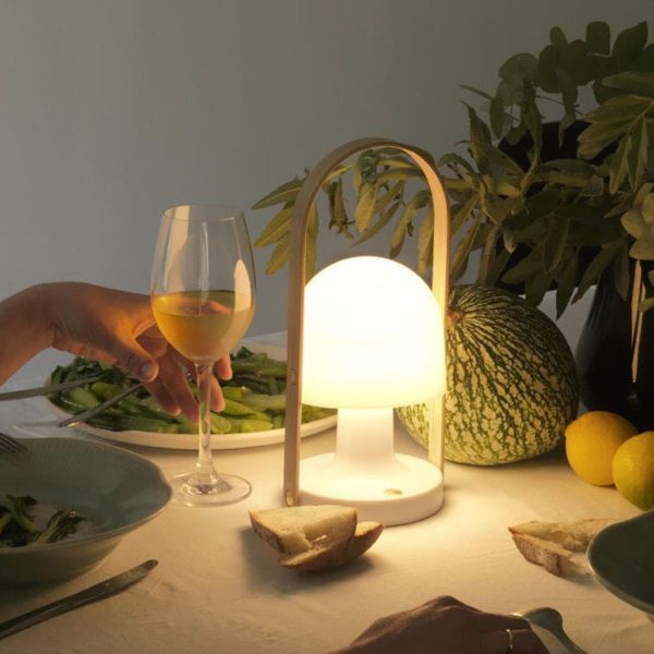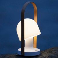 Designed by Inma Bermúdez in 2014, one of the distinctive traits of the FollowMe portable lamp is the way in which the wooden handle, rather than being a primarily functional element as in other portable lamps, is the core aesthetic element of the design as a whole. It functions as an airy frame for the rocking opal diffuser and matte polycarbonate body, which together constitute the second main element of the FollowMe portable lamp. The elegant opal diffuser itself can be tilted, which allows you to direct better the warm and gentle LED light it emits for activities such as book reading.