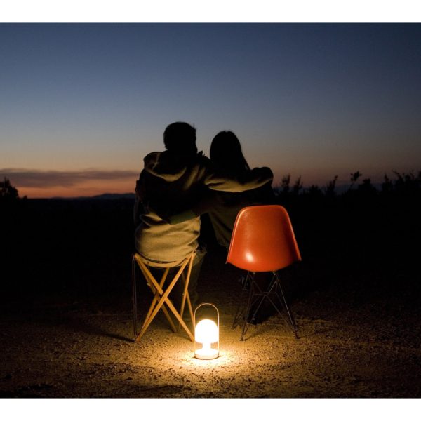 The FollowMe portable lamp can be set on any flat surface, indoors or outdoors. It can also be hanged and used as an overhead light. Besides being a cosy bedroom or living room light, it is also perfect for taking out to the garden or terrace. The light intensity can be adjusted by using the three-stage brass dimmer located at the lamp’s base. At the lowest intensity, the FollowMe lamp’s light is comparable to candlelight, which makes it an ideal lamp for outdoors dining. If you want an enhanced light output for outdoor activities, you might want to take a look at the FollowMe lamp’s larger sibling, the FollowMe Plus lamp.