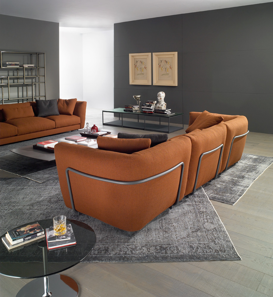 The seat collection Form consists in a metal platform combined with different elements. The main idea is to have the same cushion for the backrest and the seat. The rectangular base, an assembly of different tubular parts for supporting the backrest cushions and additionally the seat cushions in order to complete the unit. The tubular structure is available in two finishes: light and/or dark, in order to match with the fabric selected. The collection includes numerous pieces which can be combined, offering this way to create large corner compositions.