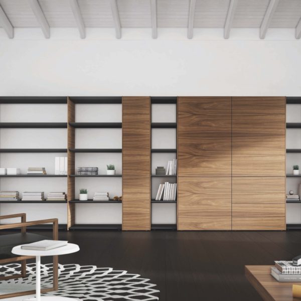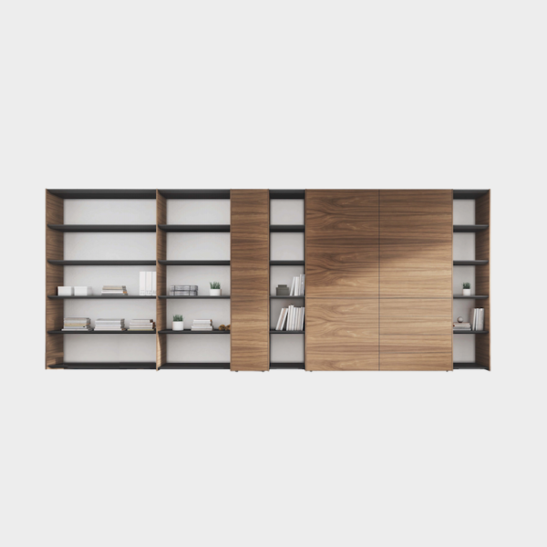 Timber vertical elements and doors with lacquer shelves and bilamintated interiors. For more custom options, please contact us.