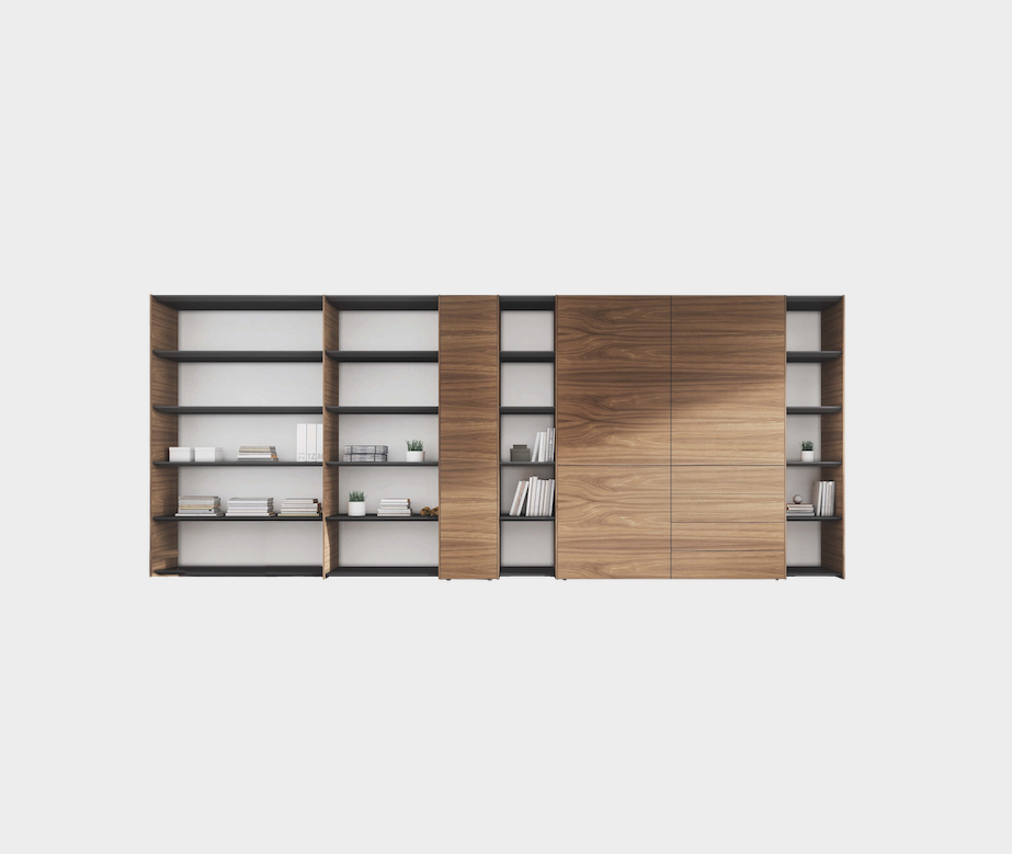 Timber vertical elements and doors with lacquer shelves and bilamintated interiors. For more custom options, please contact us.