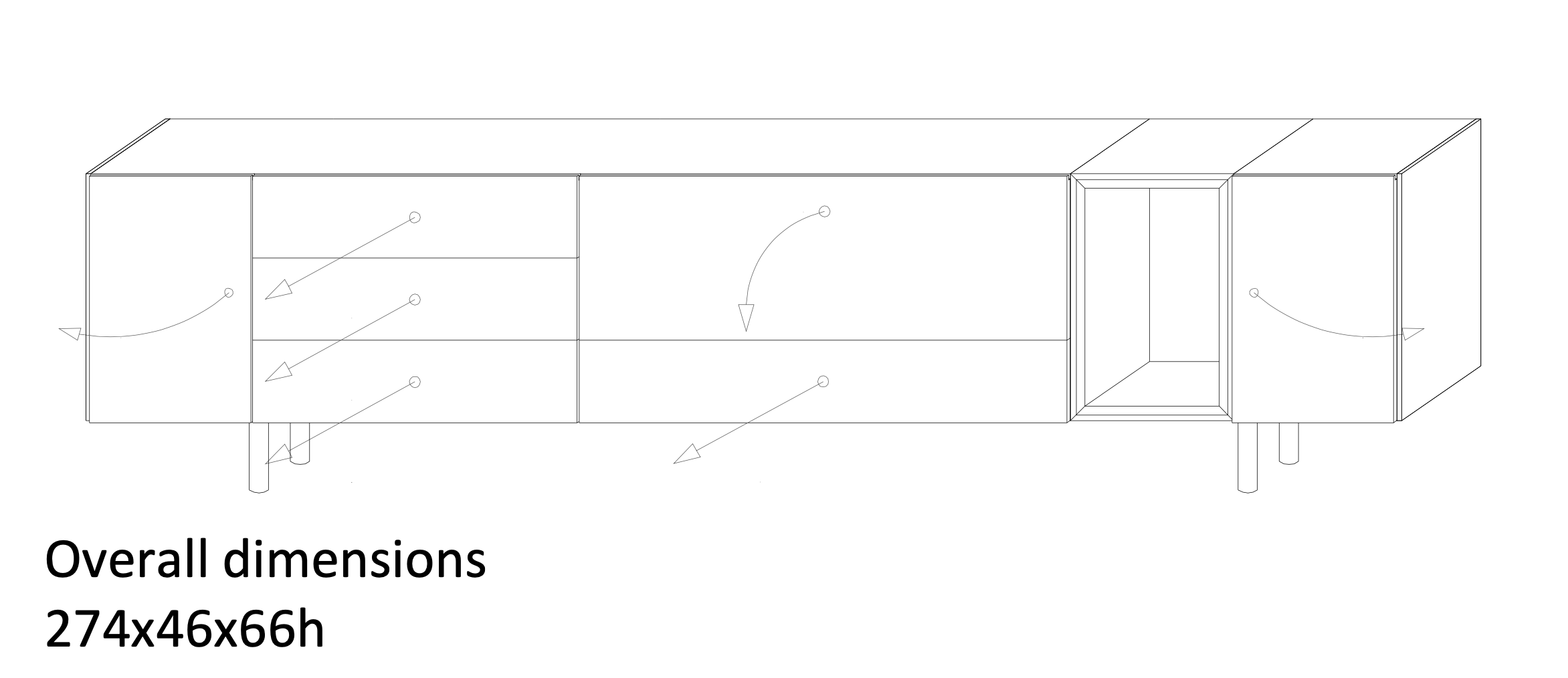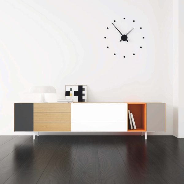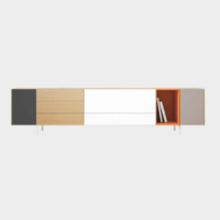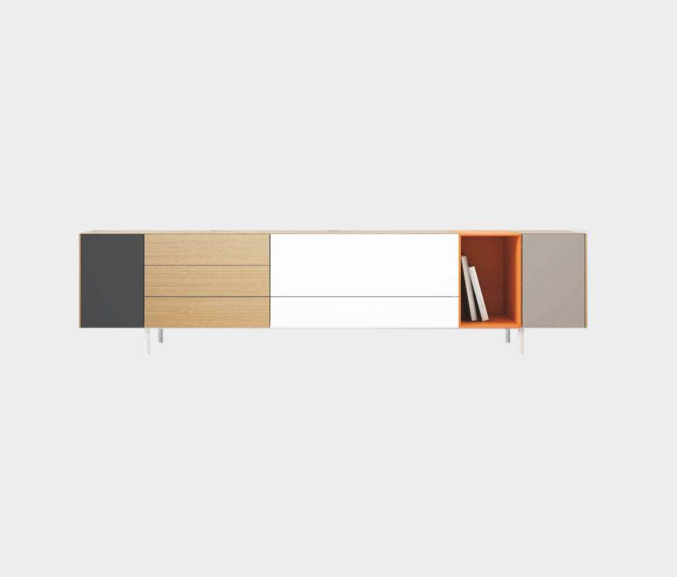 Oak top and side panels. Lacquer and oak fronts (as per picture) and white lacquered metal base. Two doors, four drawers, one flat down door, one open module. For more custom options, please contact us.