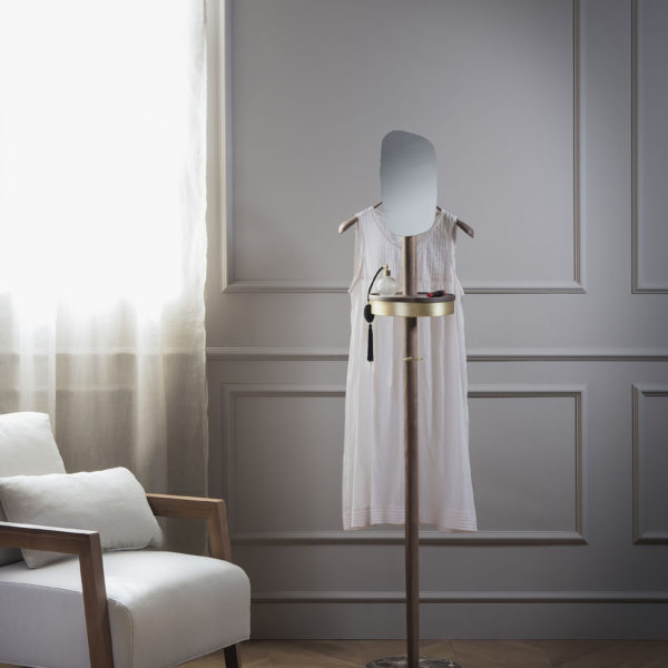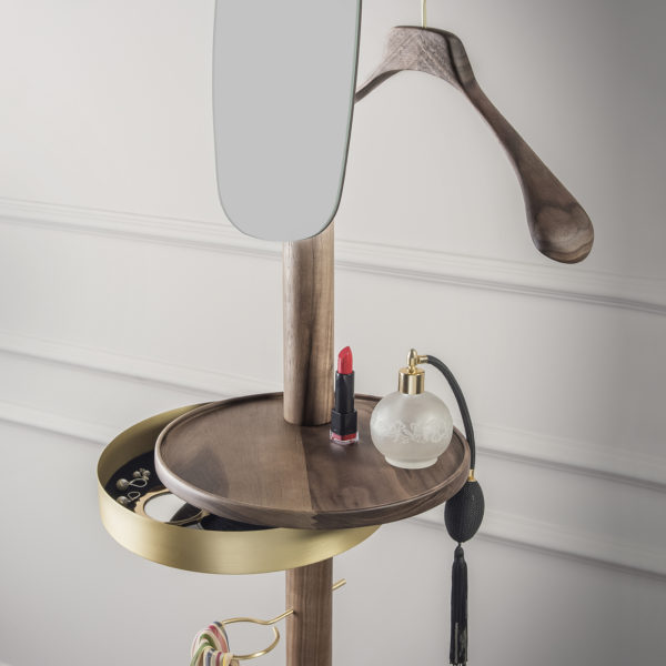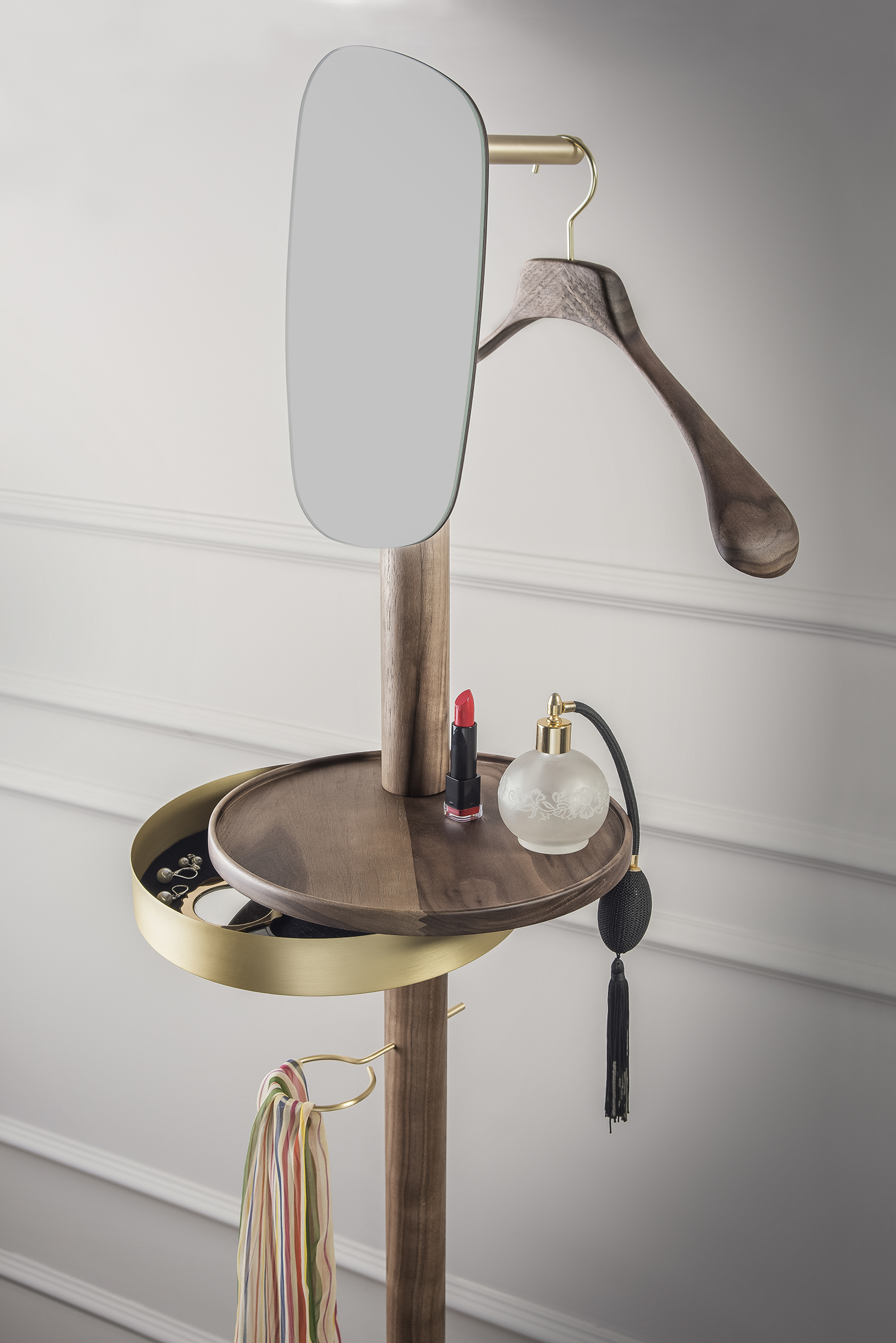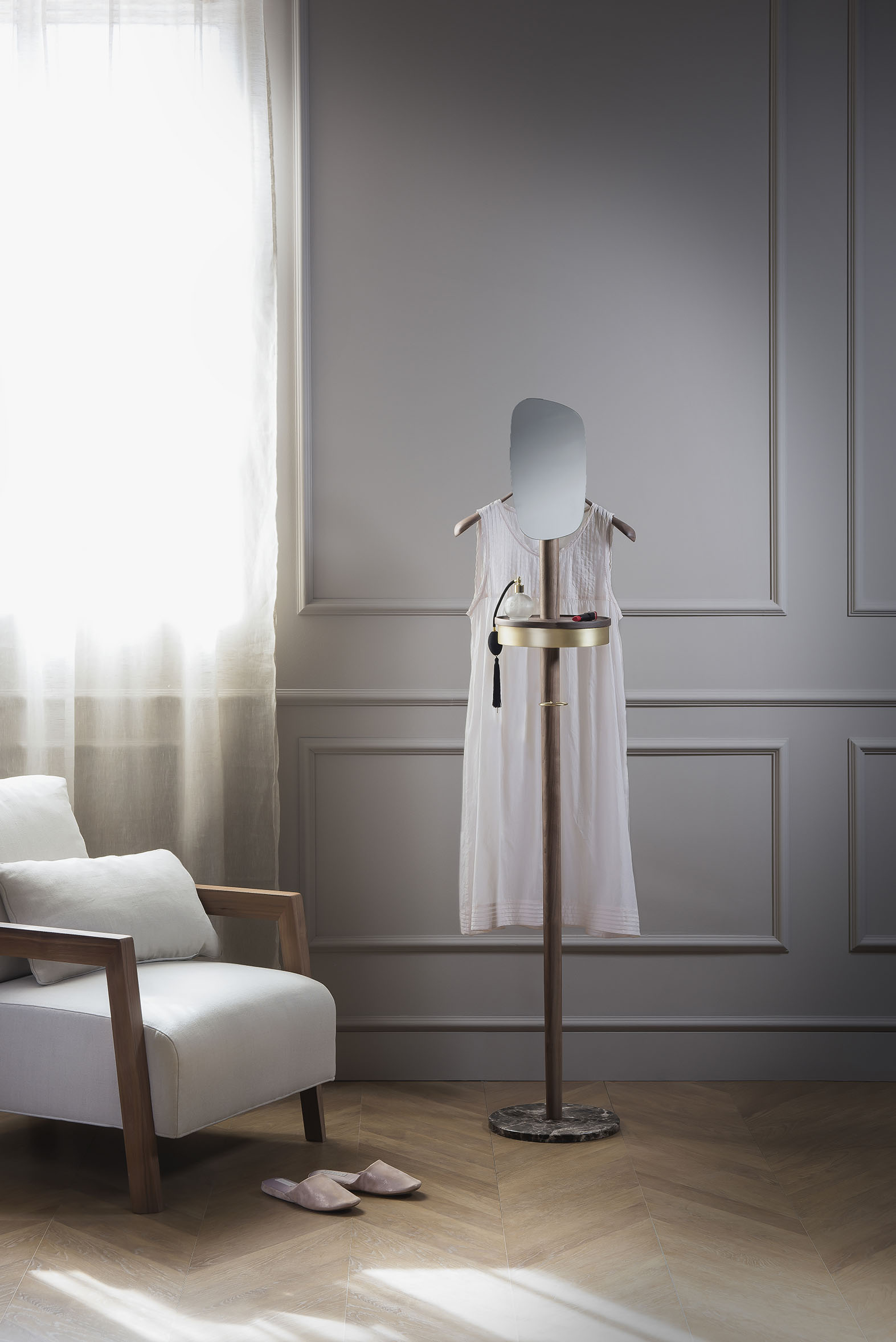 Hanger in solid walnut, manufactured by Toscanini. Emperador, Sahara Noir or Calacatta marble base. Natural solid walnut or Black stained ash structure. Accessories in polished brass or aluminium with graphite finish.
