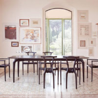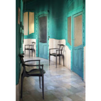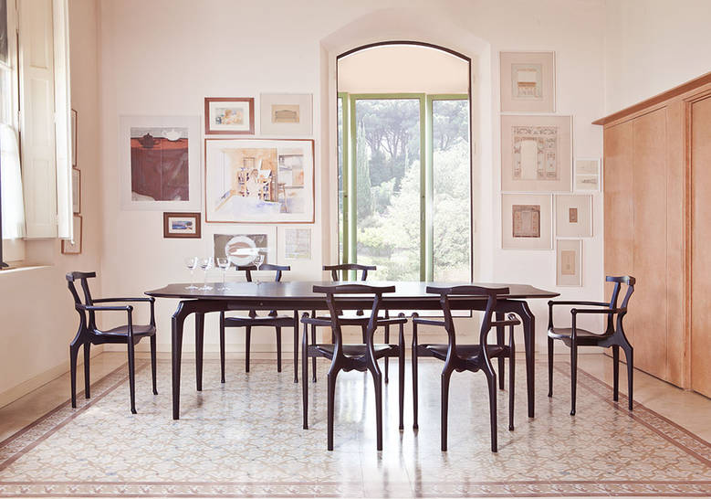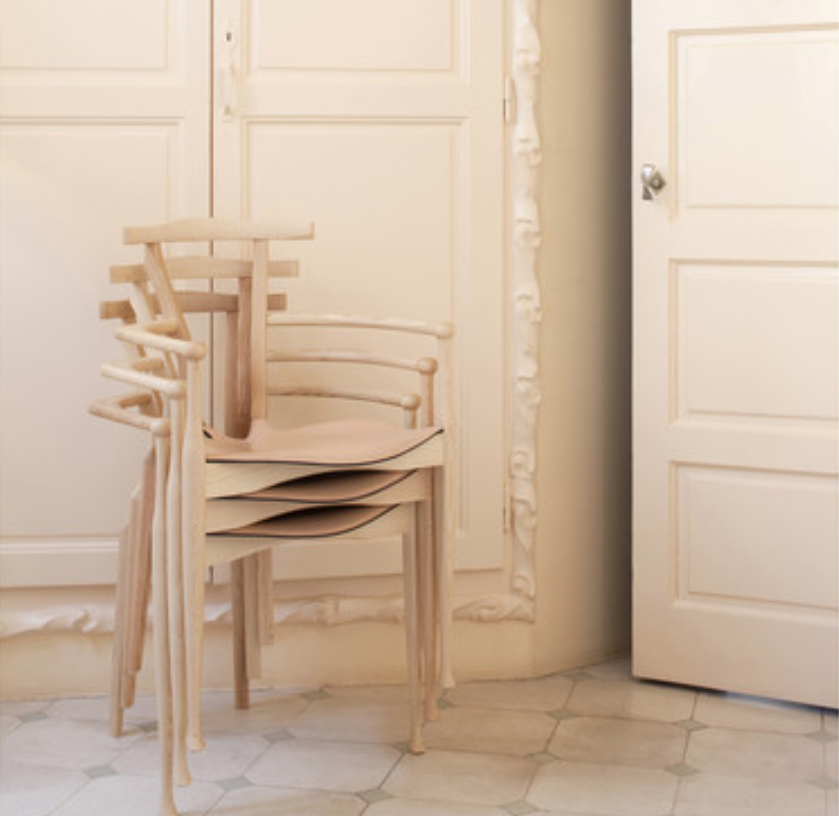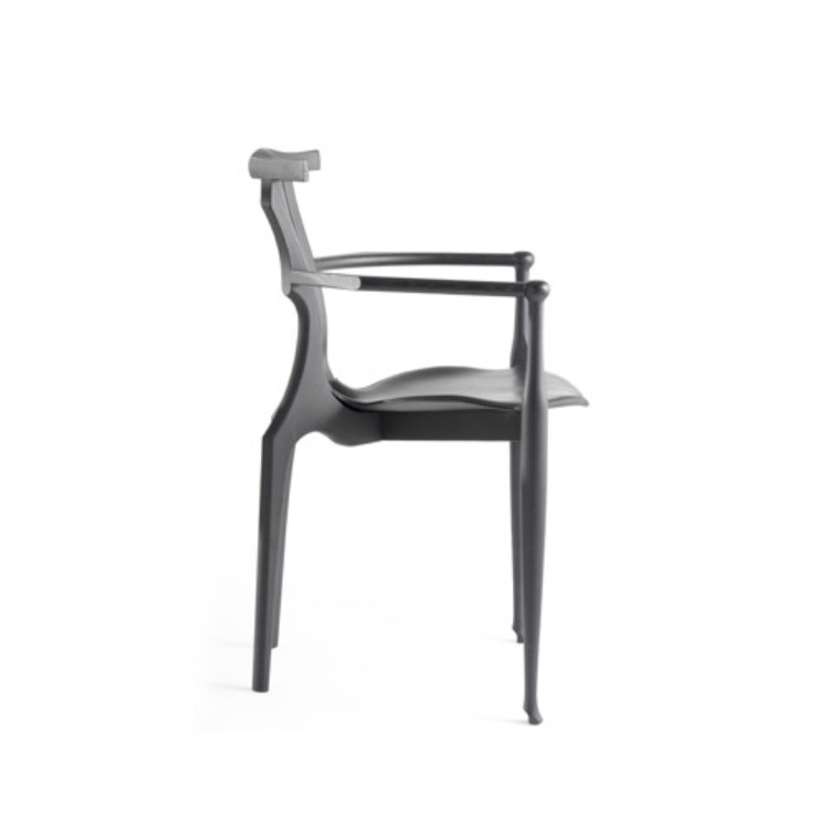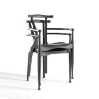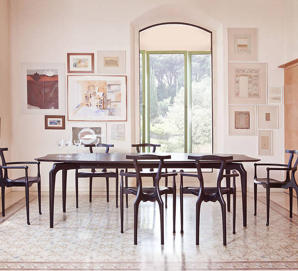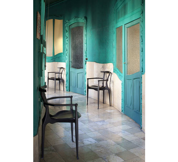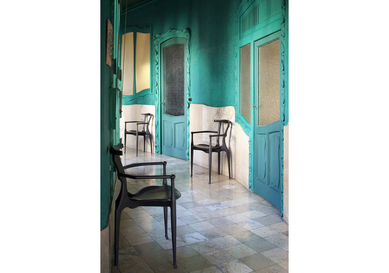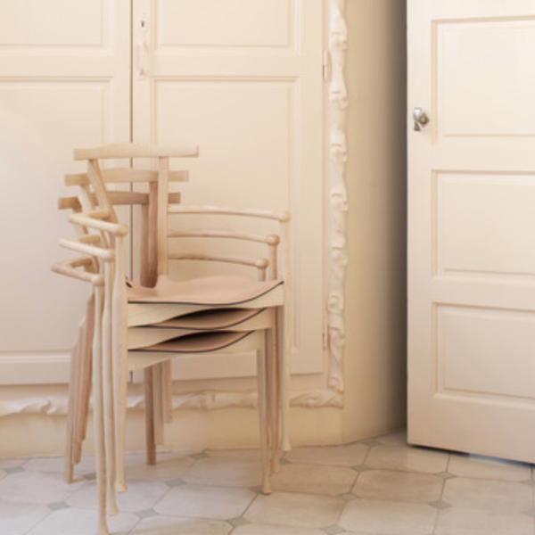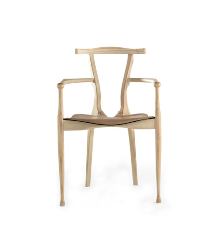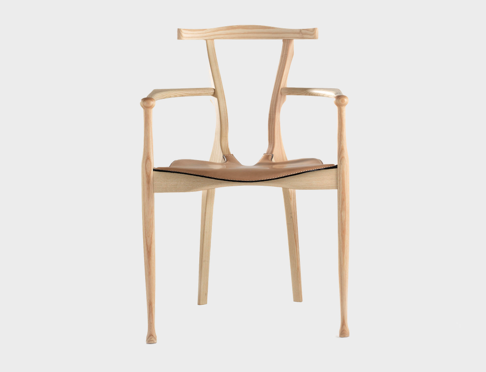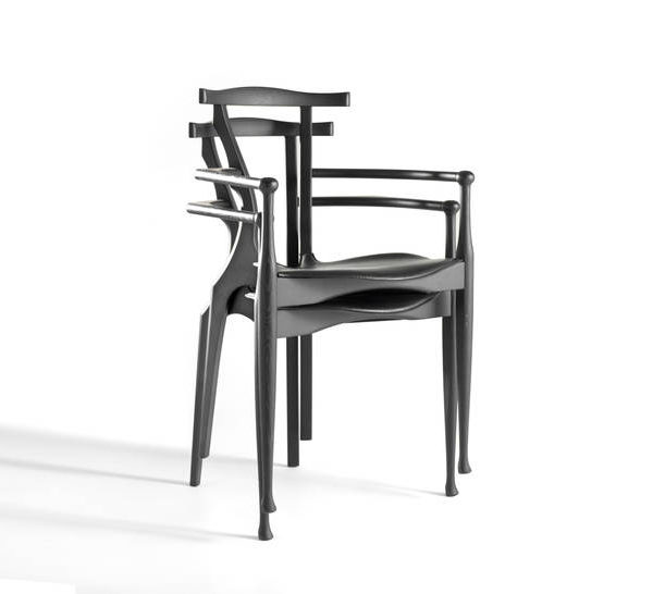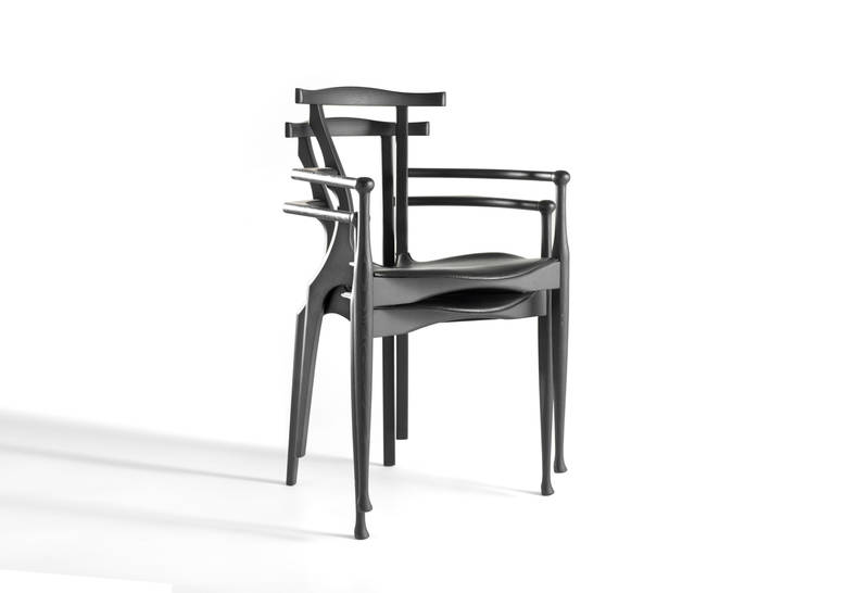 An icon of Spanish design, inspired by the organic language of Gaudà and Mollino. Solid ash structure in either natural varnish or a lacquered open-pore black finish. Plywood seat upholstered in natural coloured or black leather.