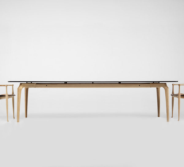 Structure and legs in solid ash. Tops tempered 10mm glass in fumé (transparent black) for the black legs or transparent for the natural beech legs.