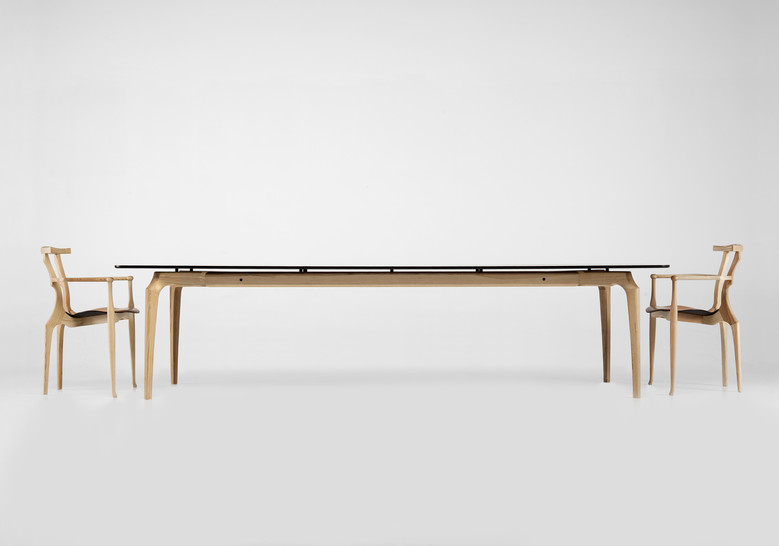 Structure and legs in solid ash. Tops tempered 10mm glass in fumé (transparent black) for the black legs or transparent for the natural beech legs.
