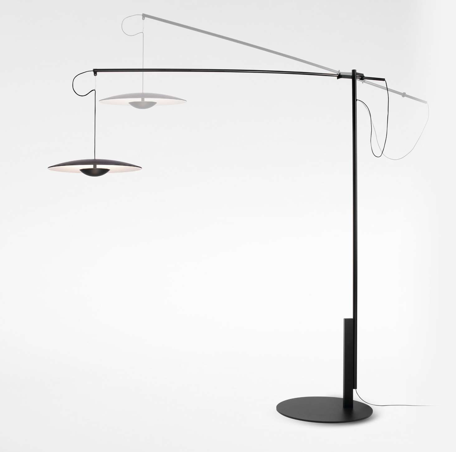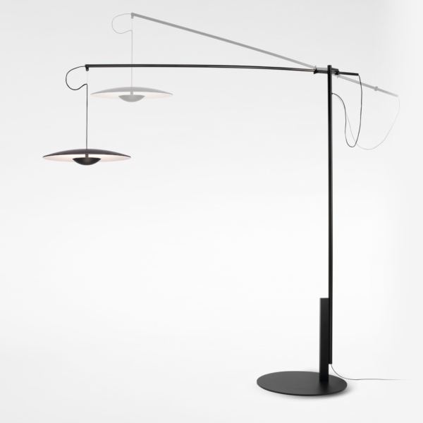 With an original system to orient and suspend it, in this floor version with movable arm the Ginger lampshade hangs from a structure that replaces the ceiling. The system allows the lamp slide forward and backward and to be folded to either size. Also, the carbon fiber arm has two possible movements depending on the pre-established position of the pivot joint. It is altogether striking, spectacular yet contained. It comes in two sizes to fit the needs of different spaces.
