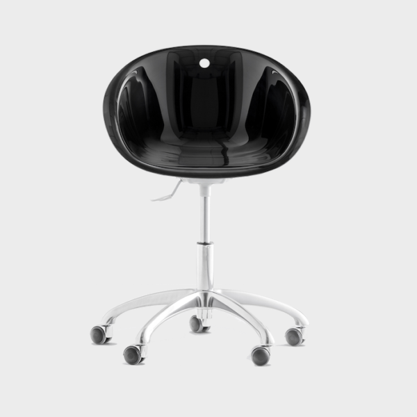 Gliss has a cozy and ergonomic shape which takes its inspiration from iconic chairs of the Fifties, featuring by the distinctive element of the hole in the shell. The collection stands out for comfort and functionality, thanks to its sinuous armrests that allow a handy grip, as well embrace the body. Swivel armchair with a polycarbonate shell and die-cast aluminium five-star base with castors. With a gas lift device.