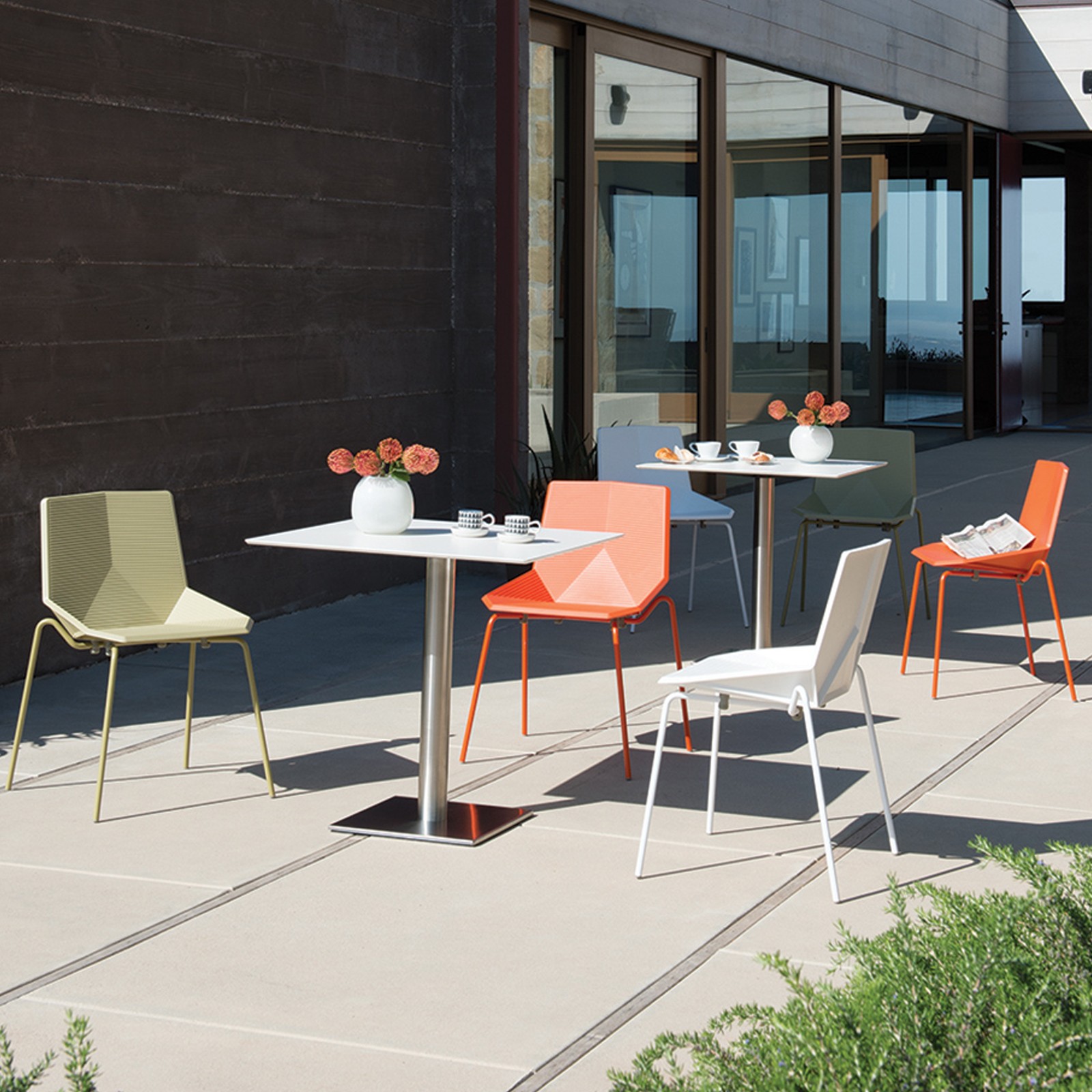 The metal version of Green Colours chair takes a step outdoors thanks to its hardwearing materials and metal structure, using epoxy paint applied via cataphoresis that resists the elements. The colours of the seat, natural lively tones, combine perfectly with the palettes of gardens and terraces.
