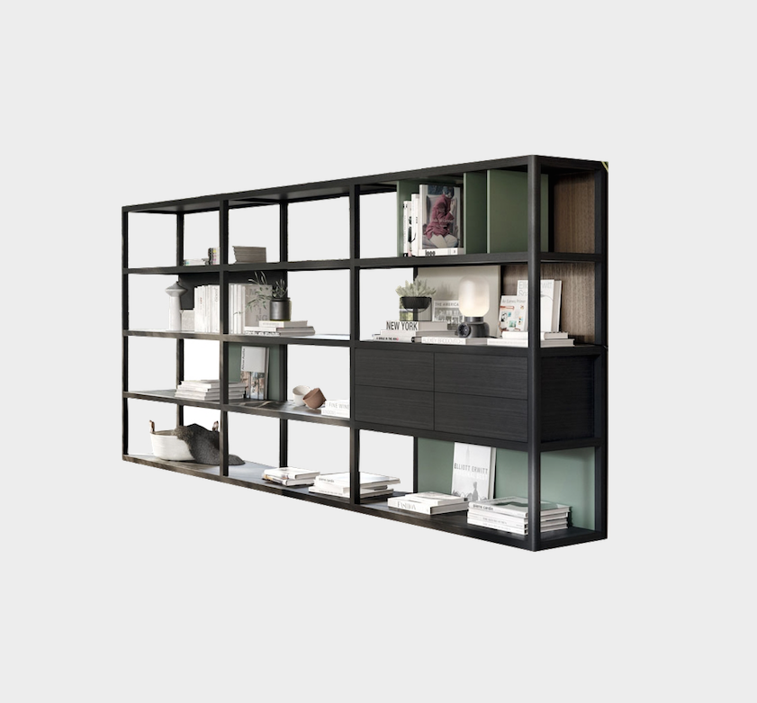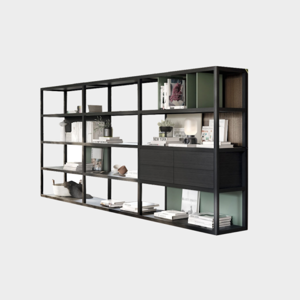 Elegant four heights Kai bookcase in dark oak with back panels and back dividers in moss green lacquer. Including 1 single divider, 1 double divider, four drawers module and 3 back panels. For more custom options, please contact us.