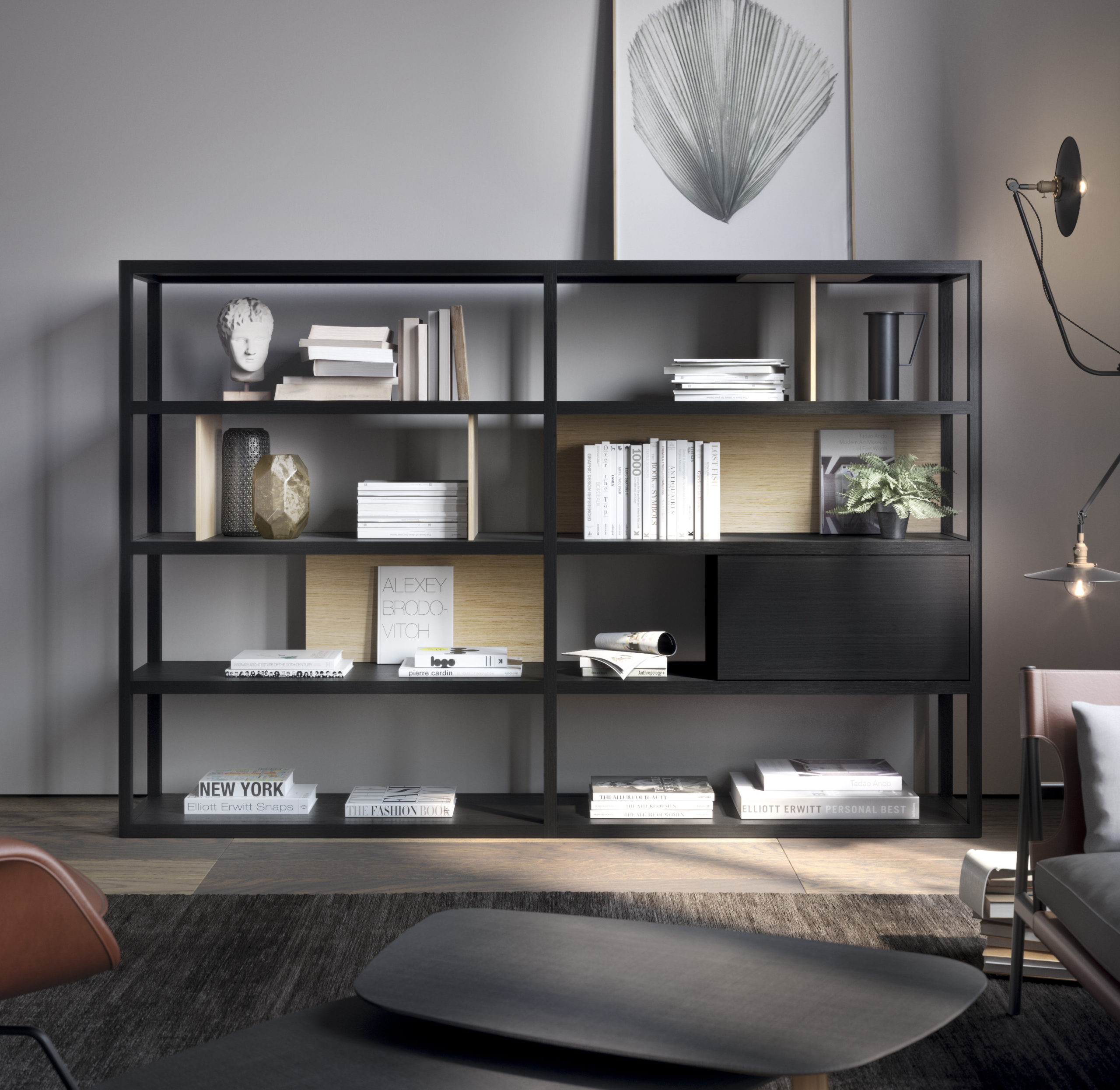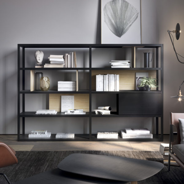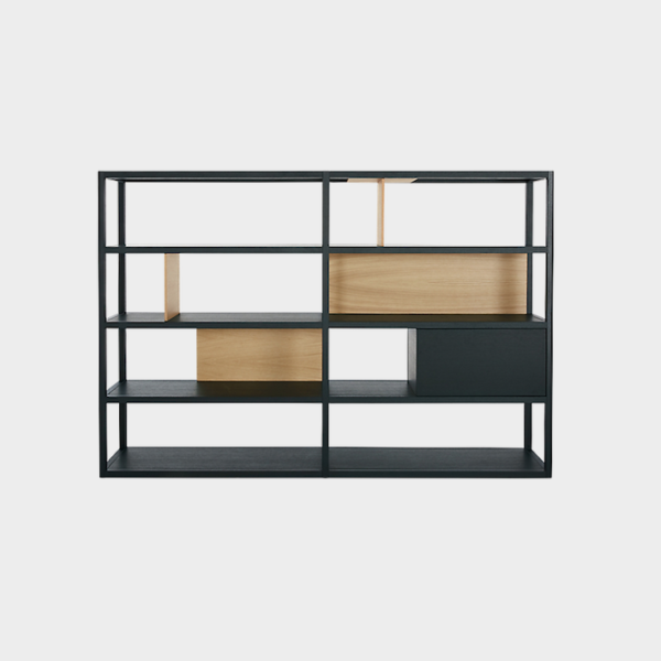 Bookcase in dark oak with back panels and dividers in light oak. Including 3 single dividers, 1 swinging door module and 2 back panels. For more custom options, please contact us.