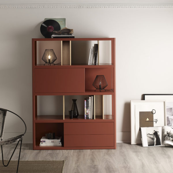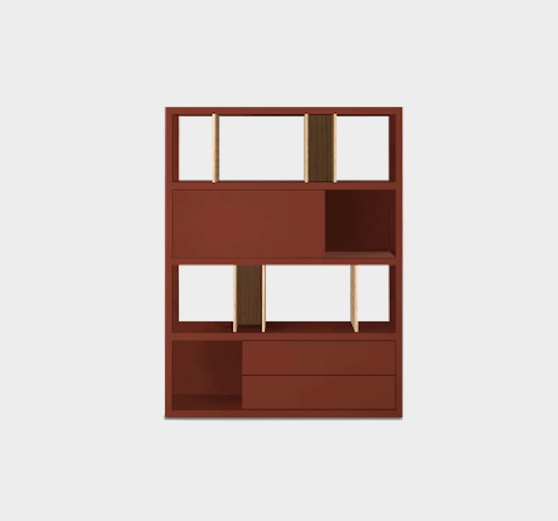 Shelving unit in Russet lacquer with 2 double dividers and 2 single dividers in oak. Including 2 drawers module, a swinging door module and 2 back panels. For more custom options, please contact us.