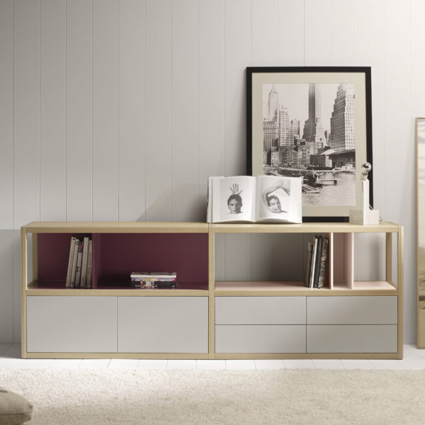 Height 800 x Length 2305 x Depth 400 mm. Sideboard in light oak with fronts in Stone lacquer and accessories in indian and nude (please refer to the finishes linked below). Including single and double divider, 4 drawers module, 2 doors module and 1 back panel. For more custom options, please contact us.