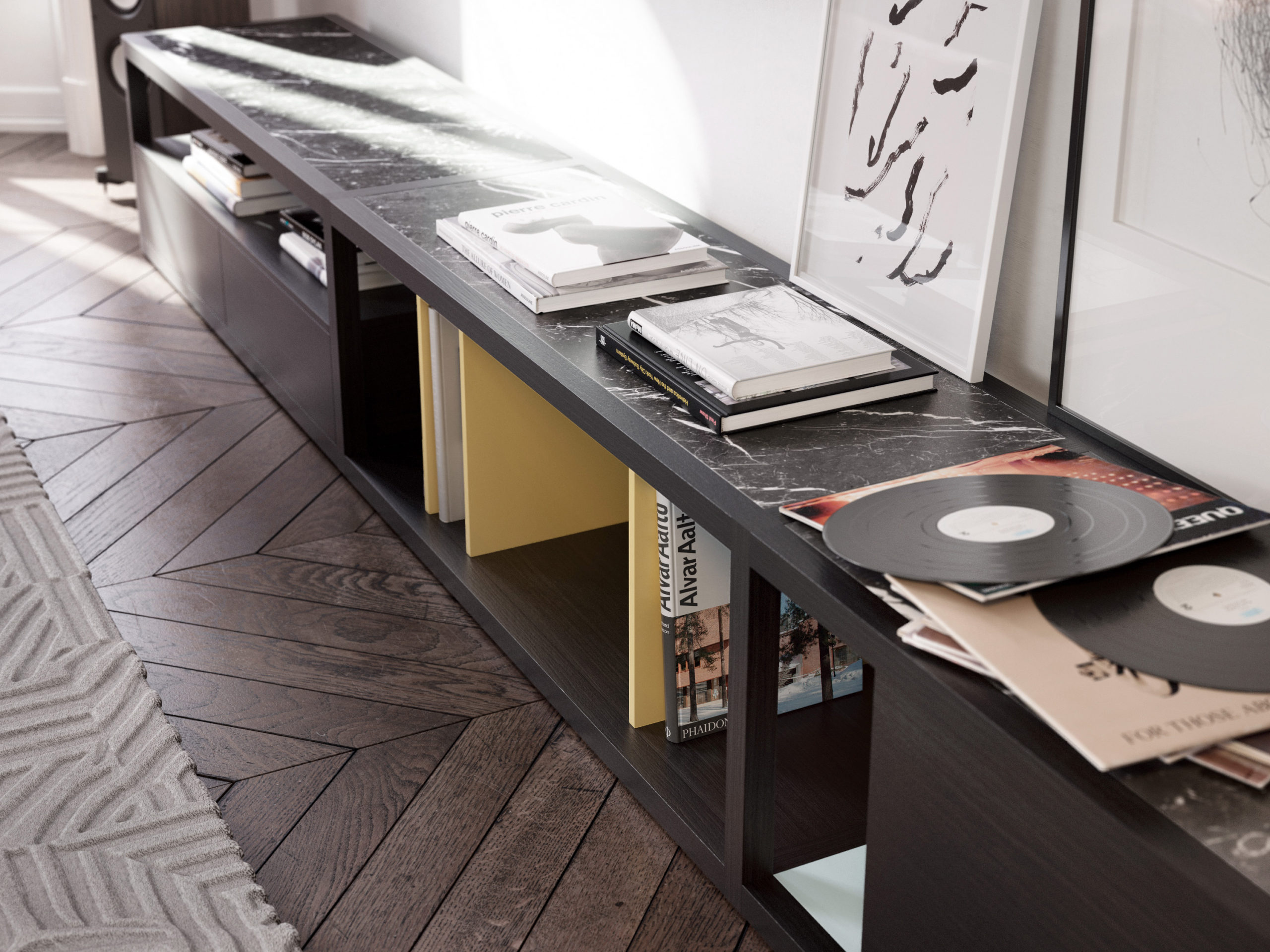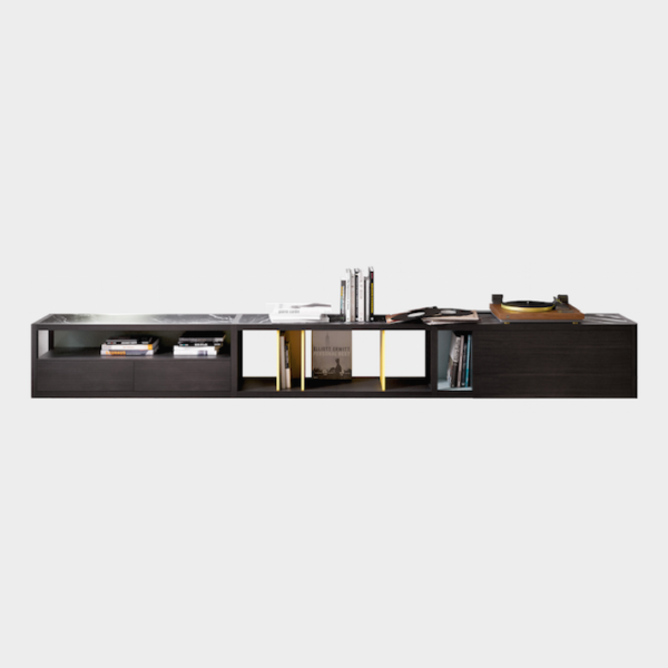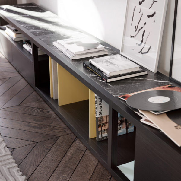 Low Kai unit in dark oak with details in Ochre and Glacier and tops in Markina marble. Including a single divider, double divider, two-drawers module, swinging door module, 3 tops in Markina marble and 1 back panel. For more custom options, please contact us.