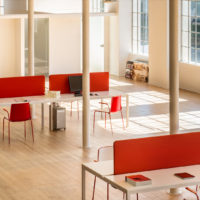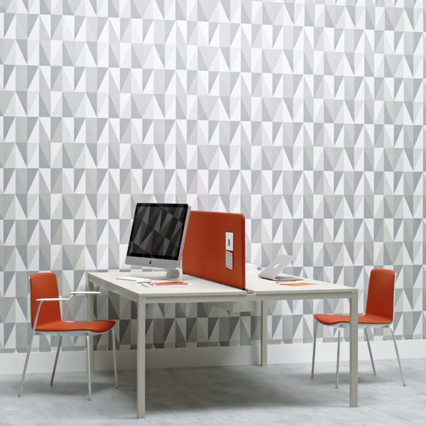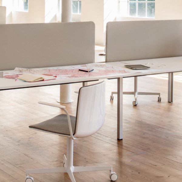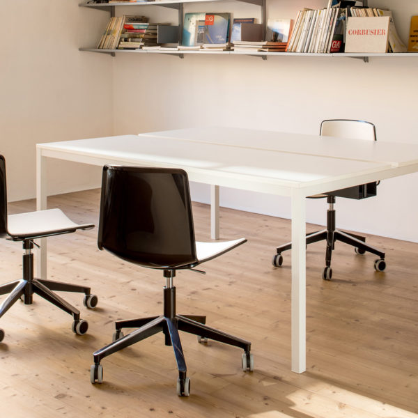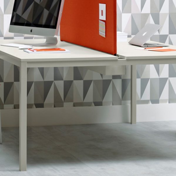 Kuadro Desk is the operative version of Kuadro table. Two or four seats work station on each side, laminate top with cable management and powder-coated steel frame. On request dividing panel covered in fabric for the separation of the space.