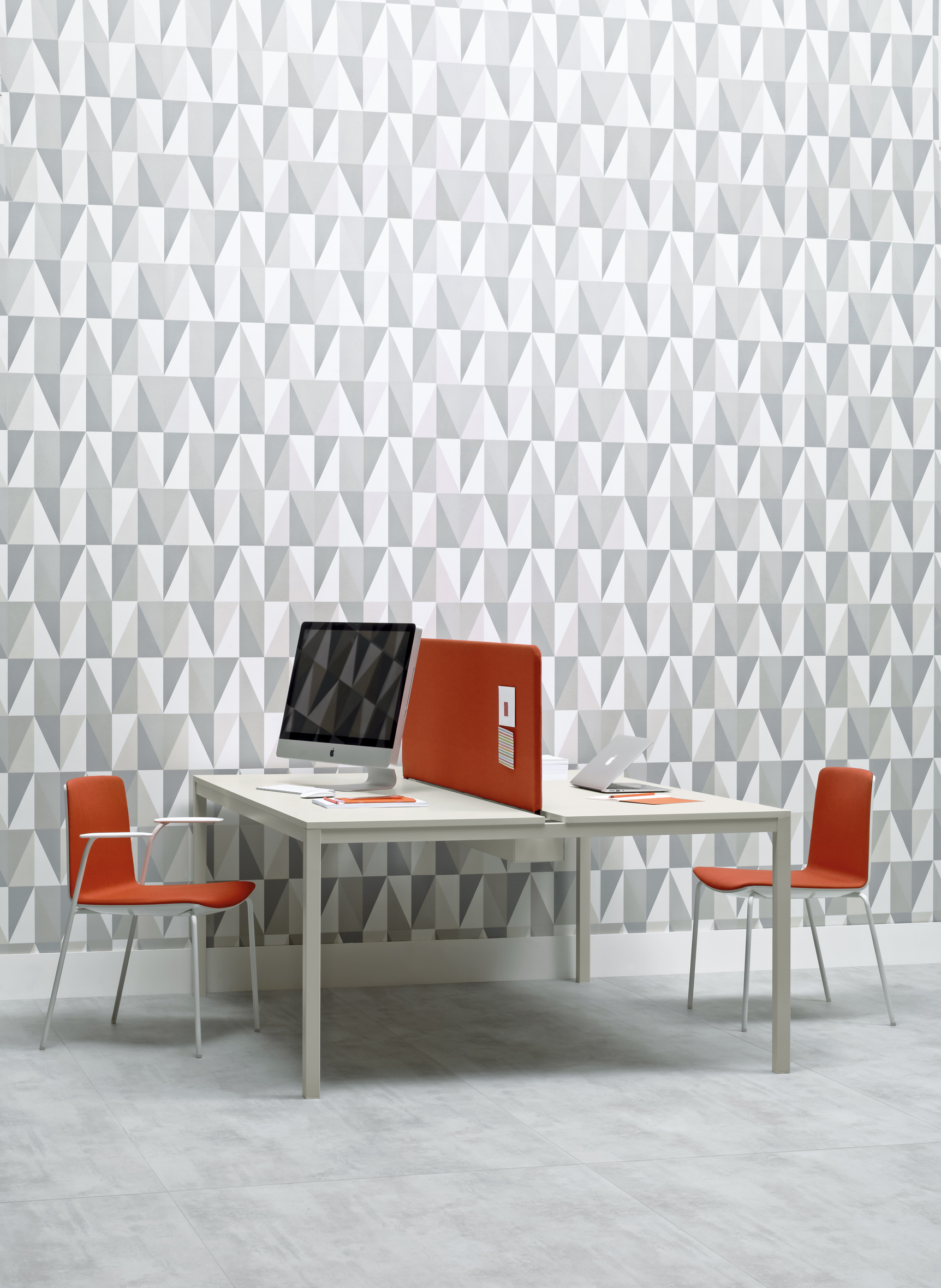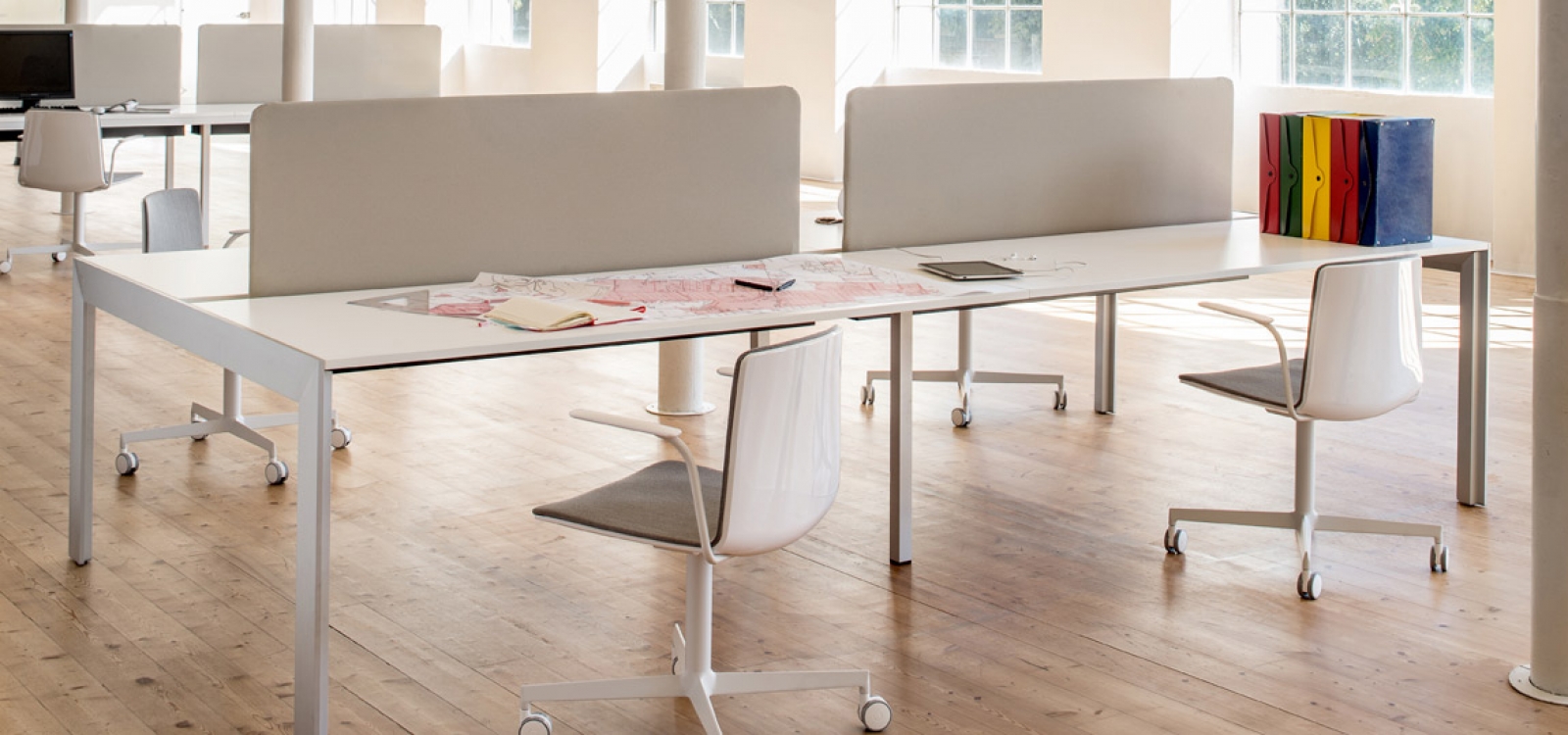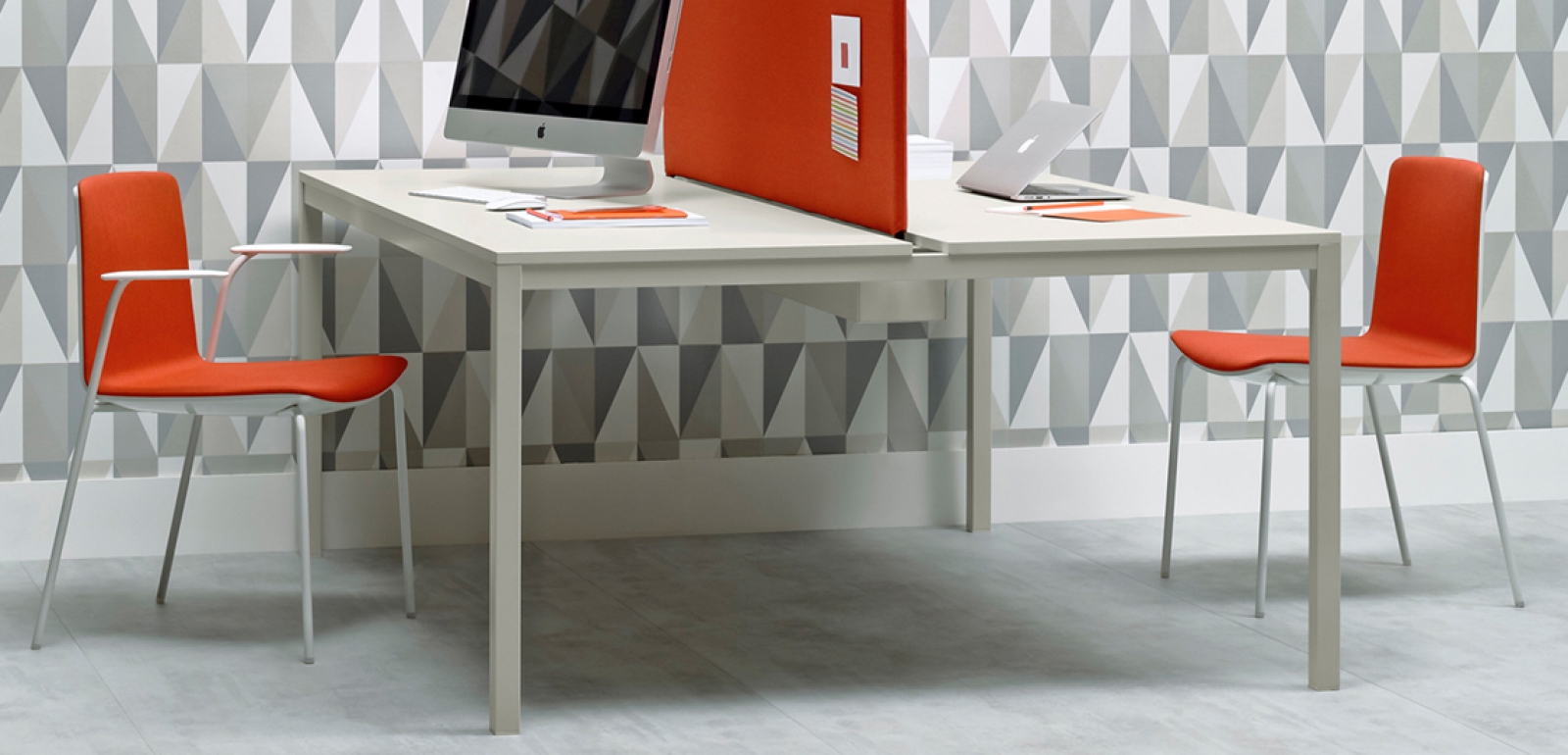 Kuadro Desk is the operative version of Kuadro table. Two or four seats work station on each side, laminate top with cable management and powder-coated steel frame. On request dividing panel covered in fabric for the separation of the space.