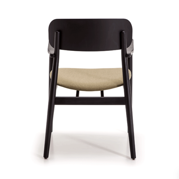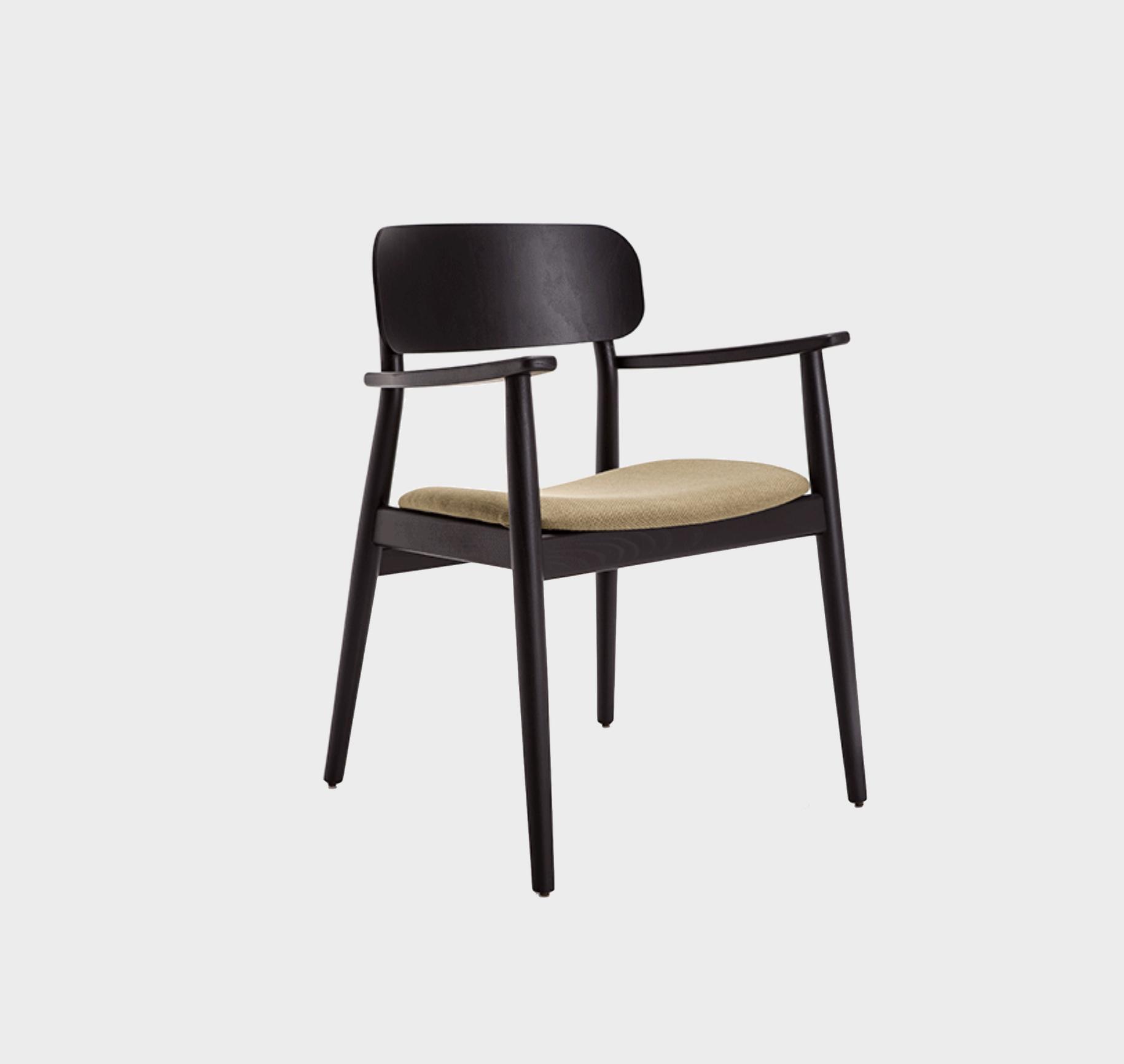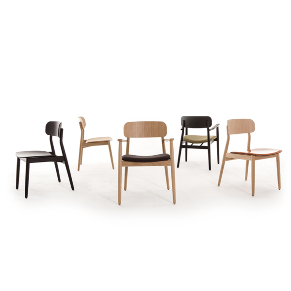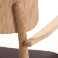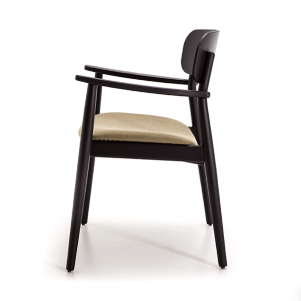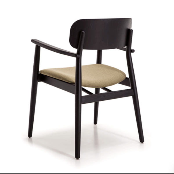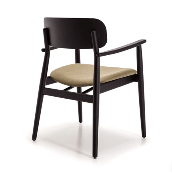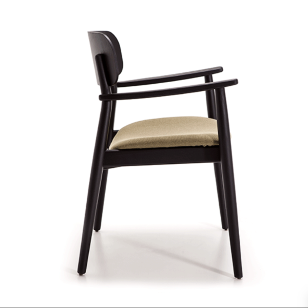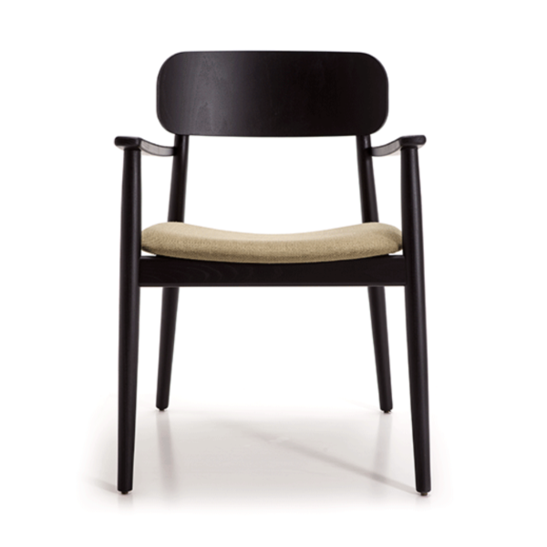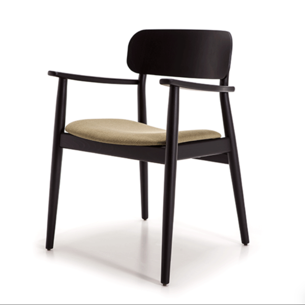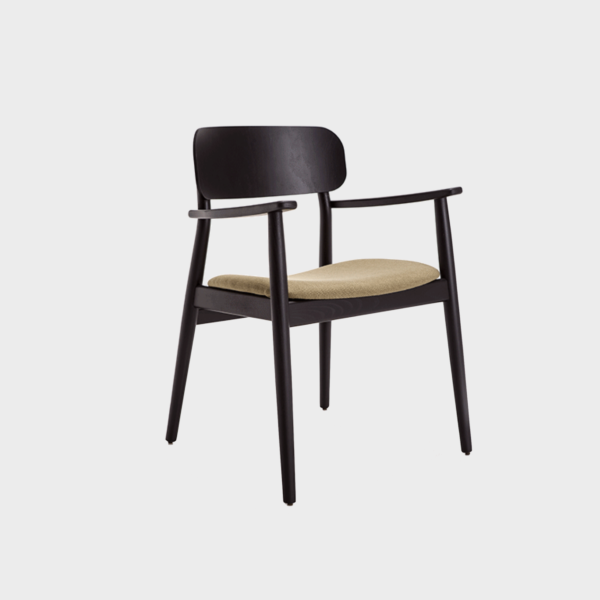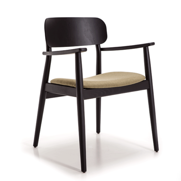 Armrest chair with solid wood frame, wooden board backrest and wooden board or upholstered seat.