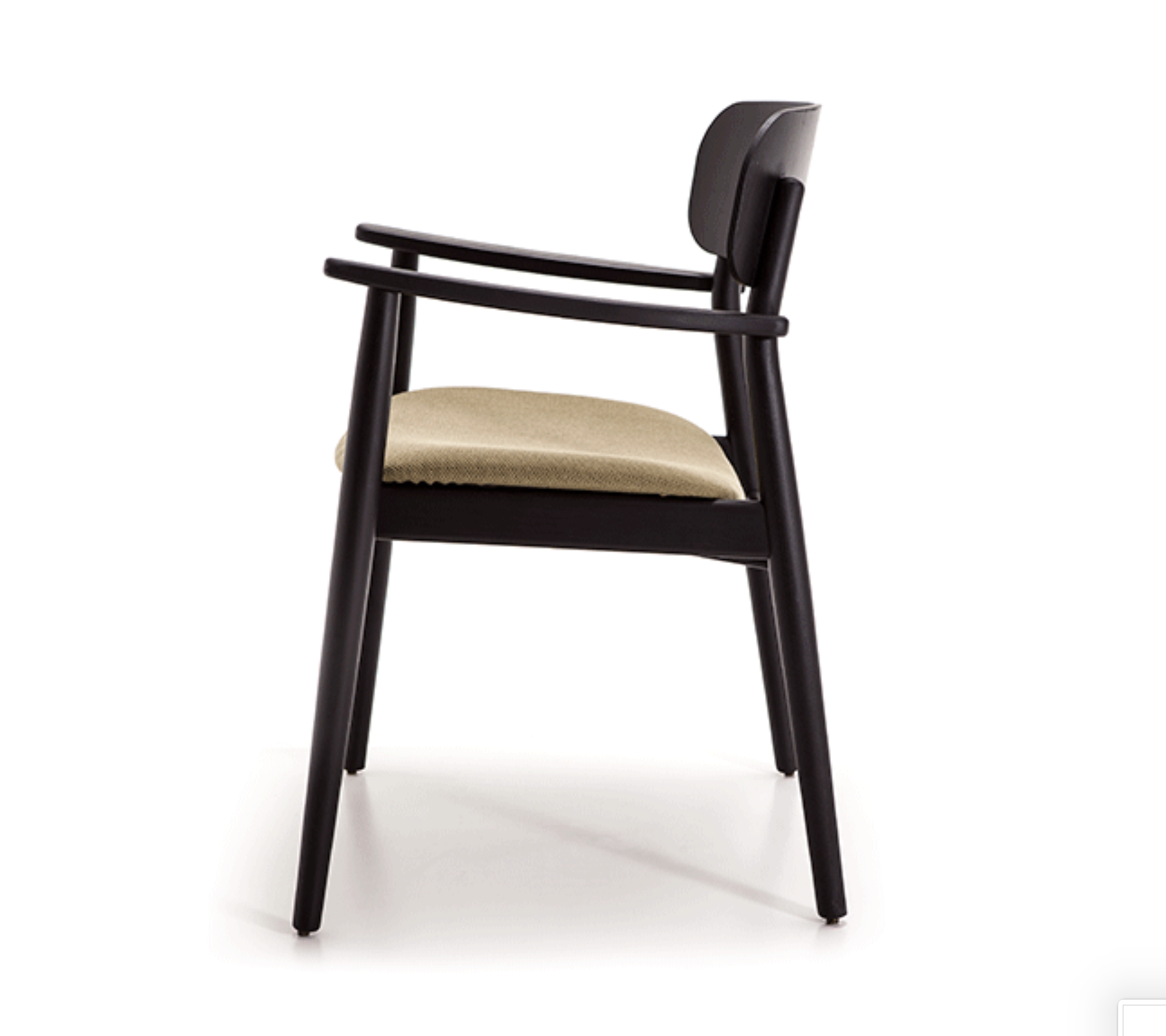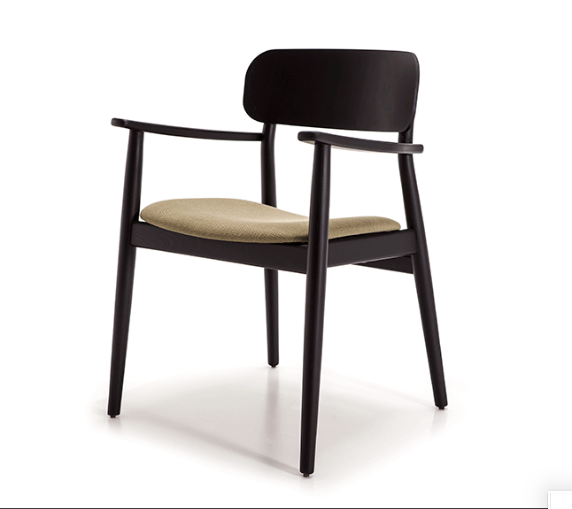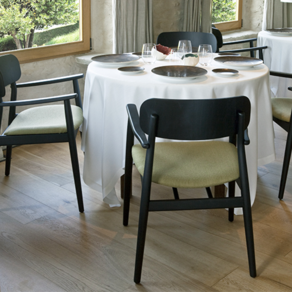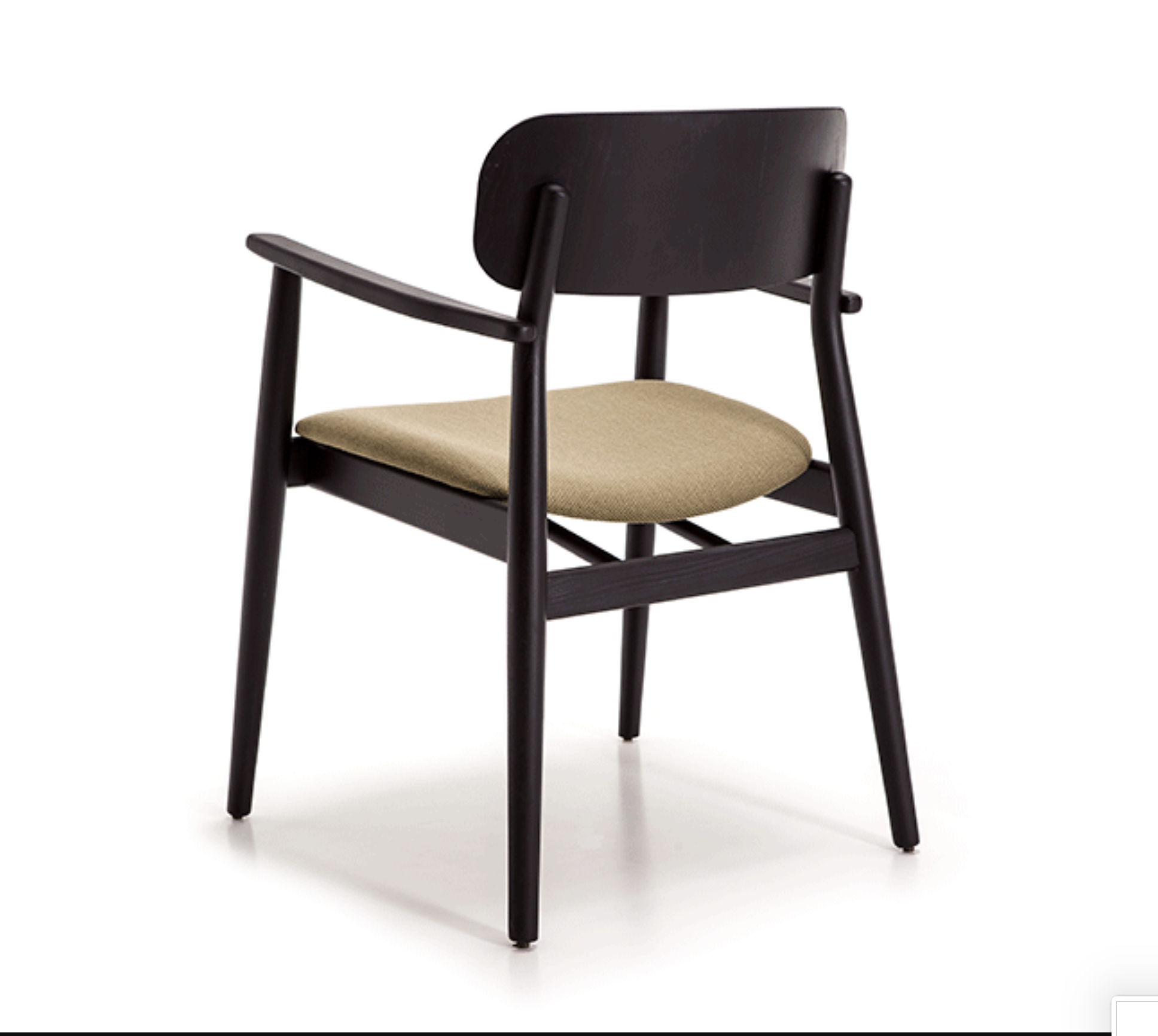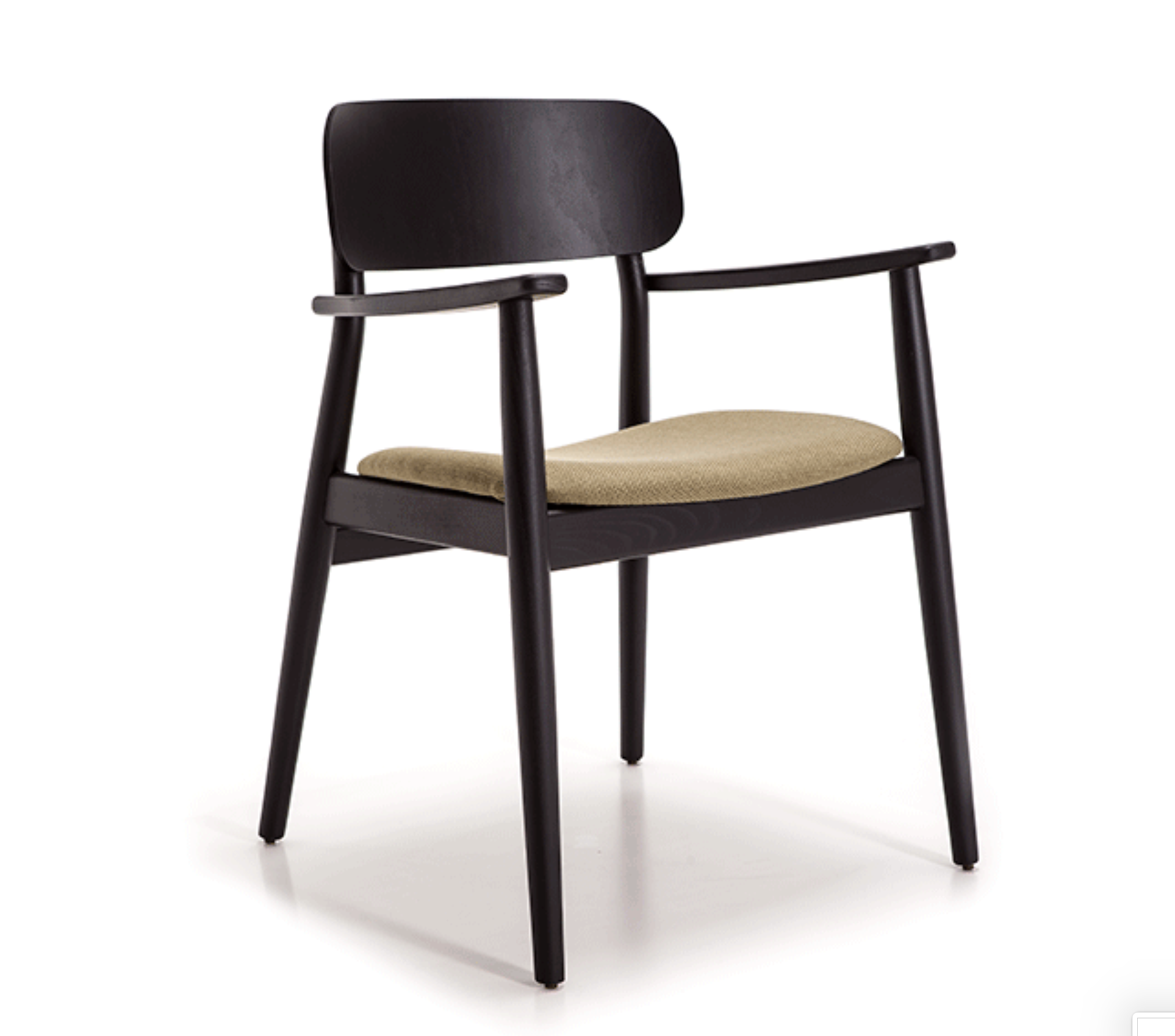 Armrest chair with solid wood frame, wooden board backrest and wooden board or upholstered seat.