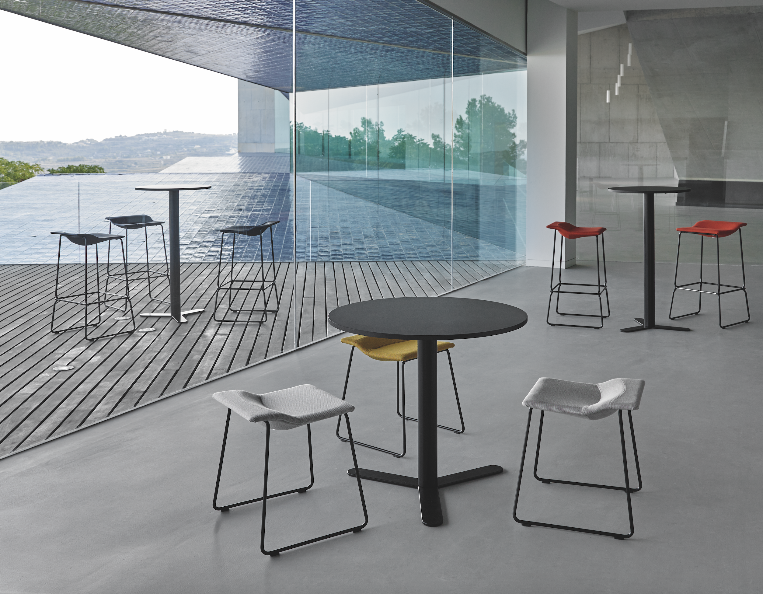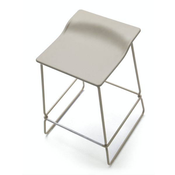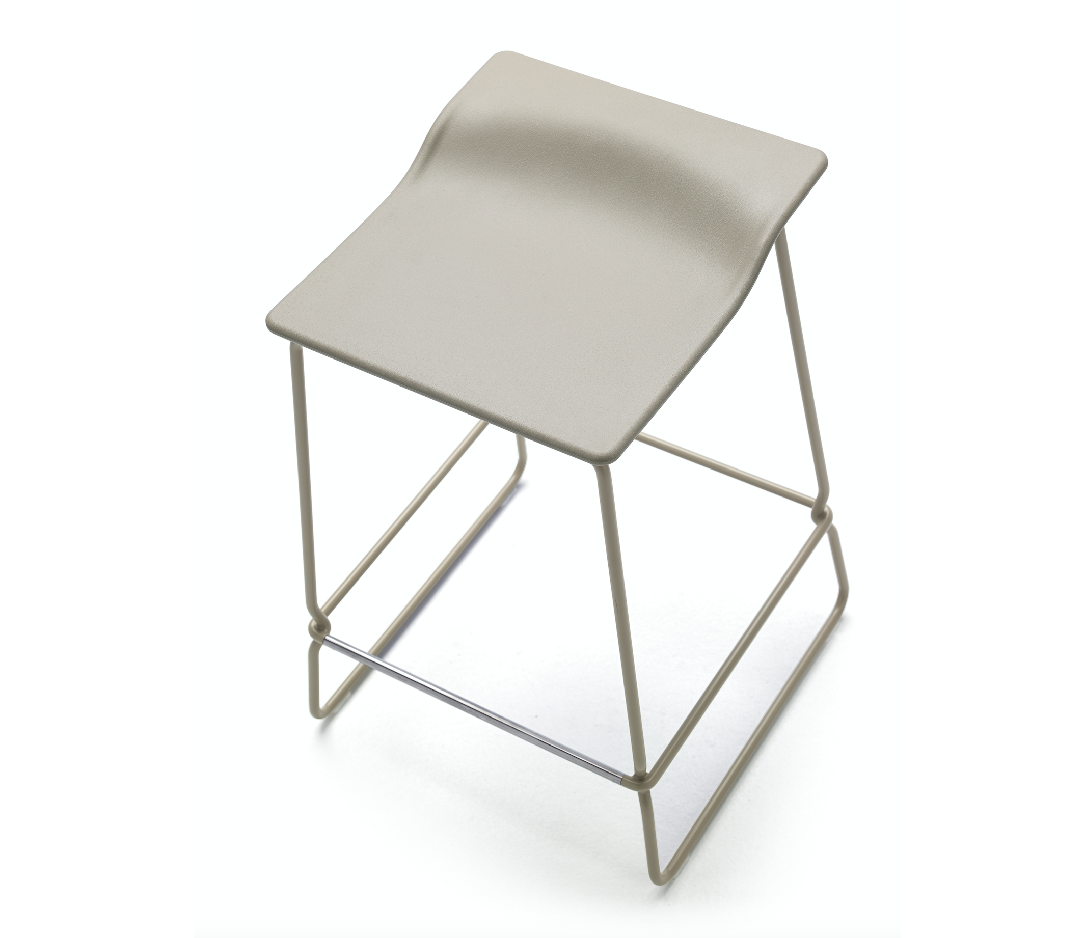 Structure in calibrated powder coated steel in thermoreinforced polyester in black, white or taupe/sand. Footrest in stainless steel. Plastic glides.