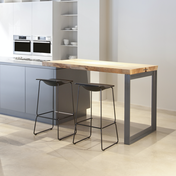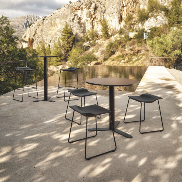 The Last Minute bar stool is built with highly resistant materials, which makes it an optimal choice for bars, cafés and restaurants, indoors and outdoors. Its distinctive structure is composed of a lacquered steel frame and a stainless steel footrest. The meticulous attention to detail shines through in the way in which their point of contact is designed: notice how the legs of the bar stool are slightly bent inwards to allow for the transversal footrest to wrap itself around them and conserve a perfectly squared shape.