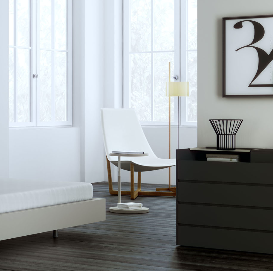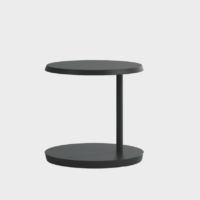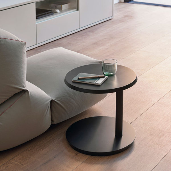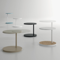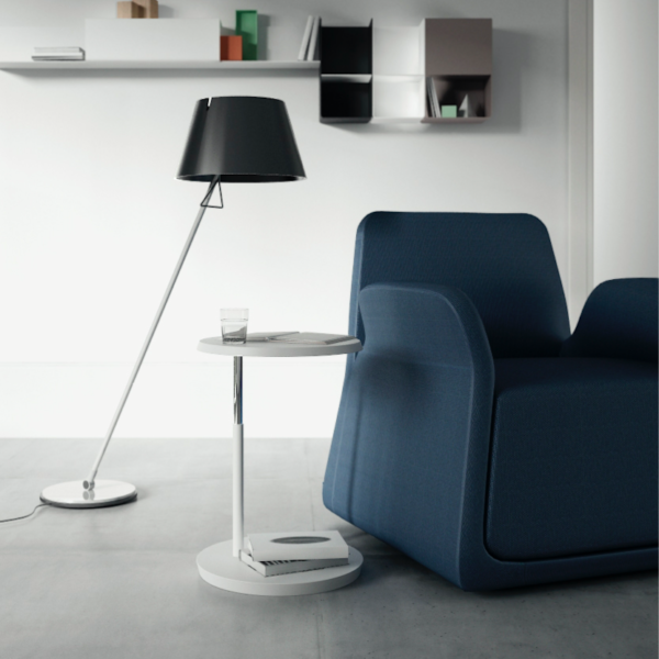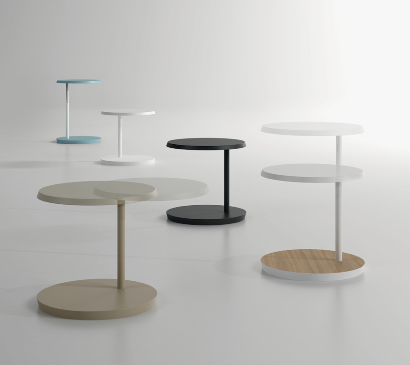 Level is a versatile coffee table adjustable to two heights, whose surface turns 360° around the metal tube that joins it to the base.