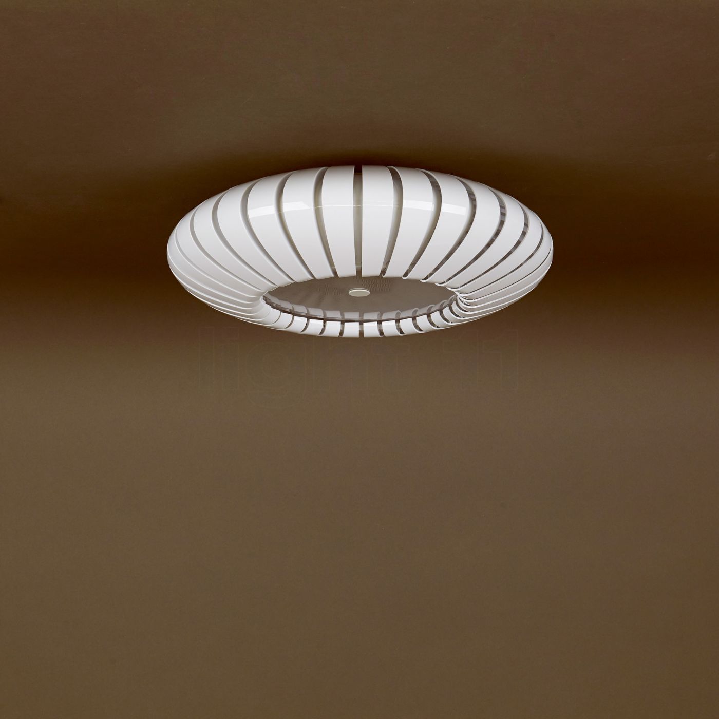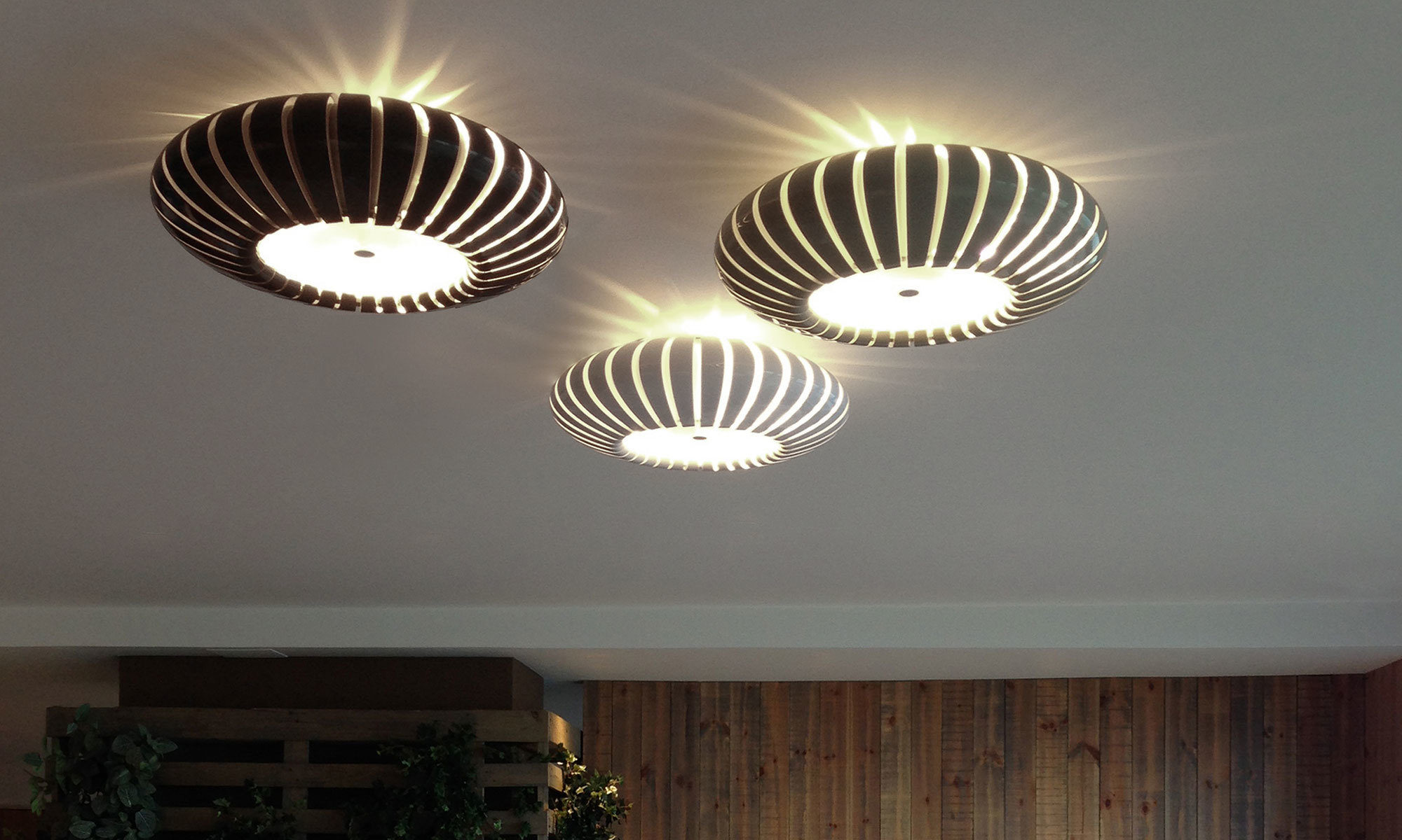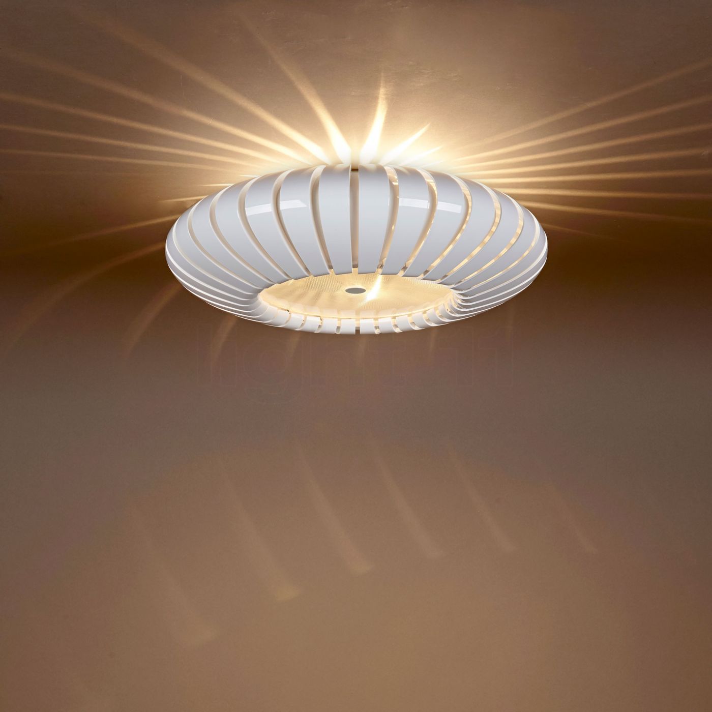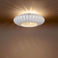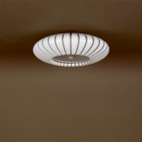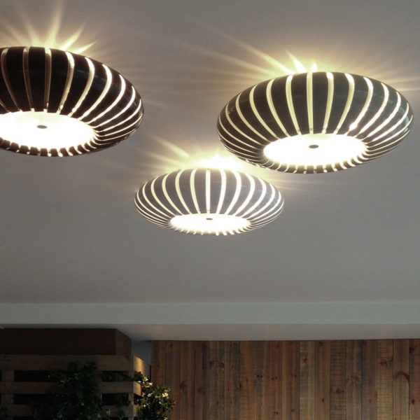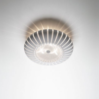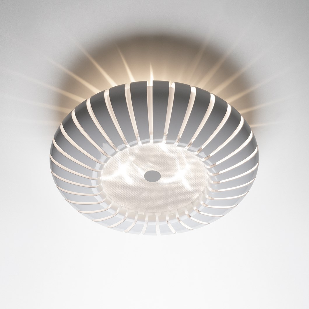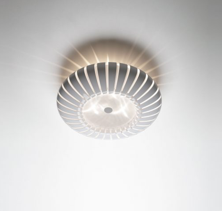 The shade is made up of 32 slice-like pieces which fit together to allow chinks of light to escape. This interplay of light and dark generates an effect which is rich in shades of light and prevents glare, while an opening at the bottom fitted with a diffuser gives out direct light downwards.