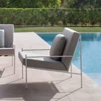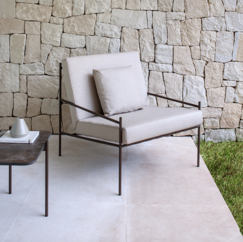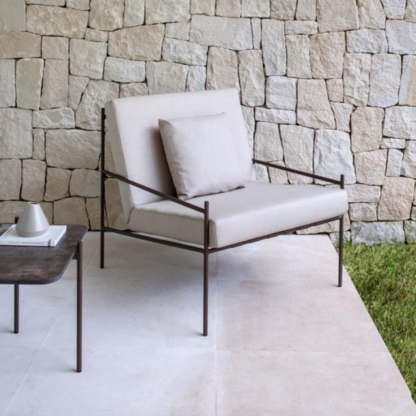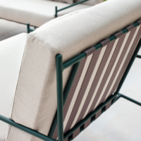 Powder-coated aluminium frame. Available in eight colours: cream 34, grey 56, snow white 70, sand 74, oxide 75, terracotta 72, ficus 73, sky blue 71. High resistance cushion in 35kg polyurethane foam with fabric cover from Point’s sample book.