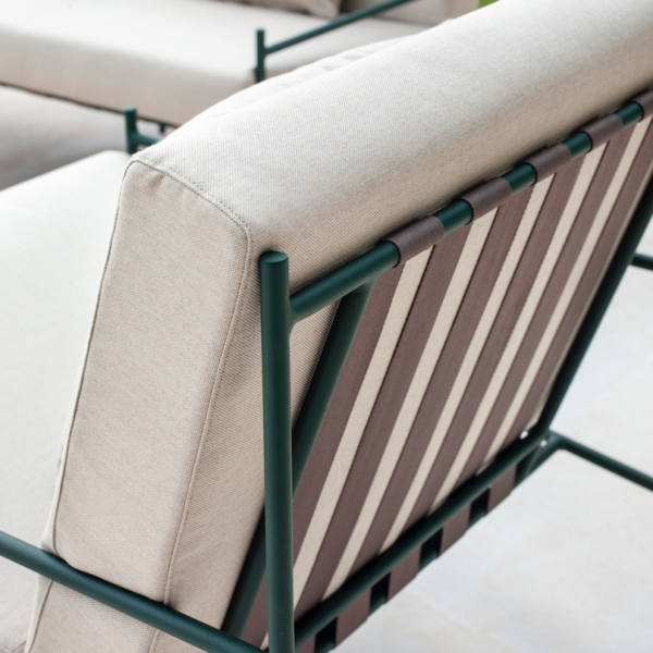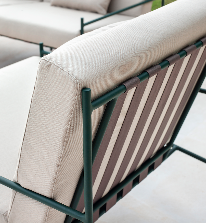 With bands stretched across the backrests and bases of the furniture in this collection, we are flooded with beautiful memories of times past. As part of the most modern outdoor furniture, their retro air creates a unique contrast against the stylised aluminium lines that make up the backbone of the Min series.