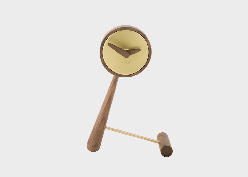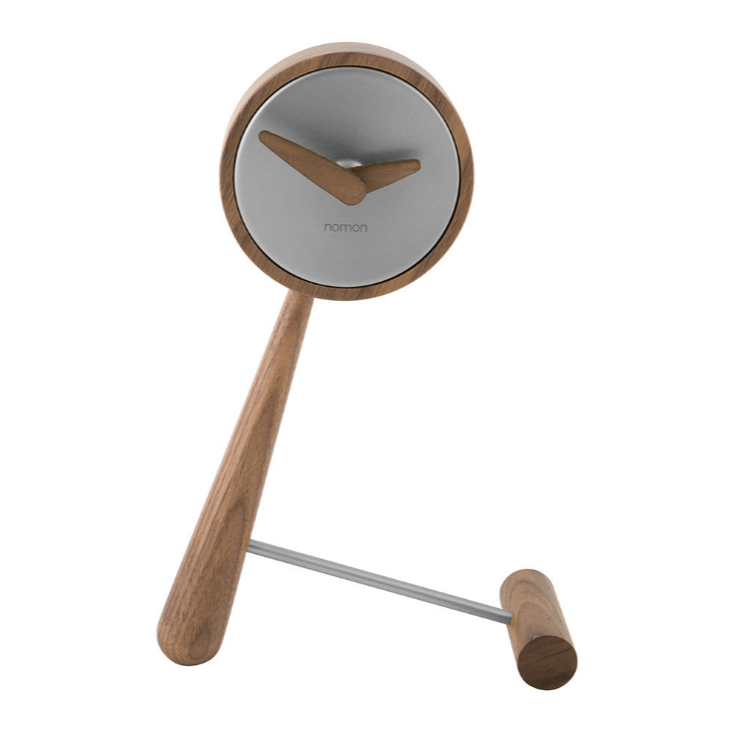 Structure and hands in walnut wood and metal in polished brass or steel graphite finish.