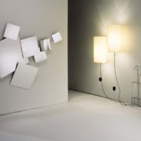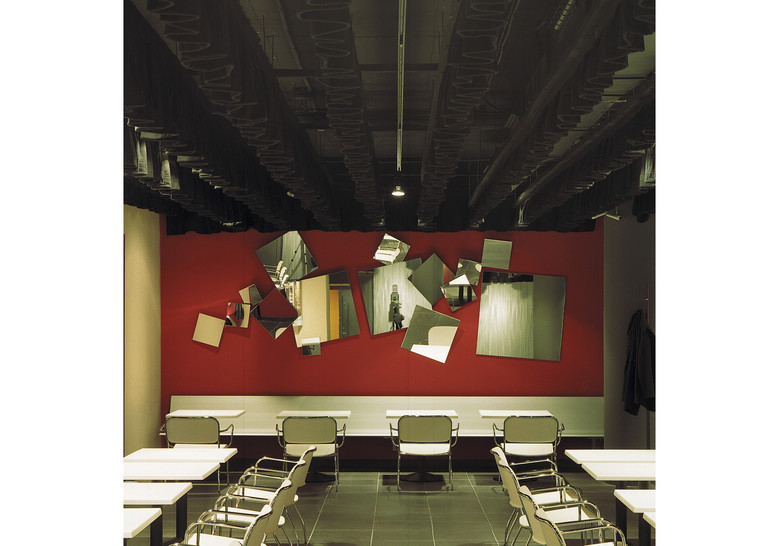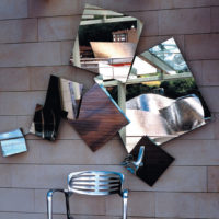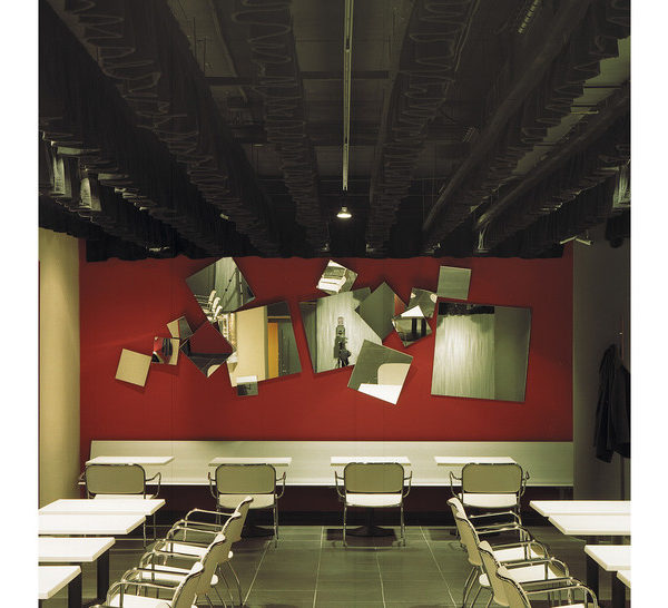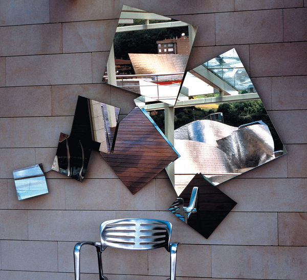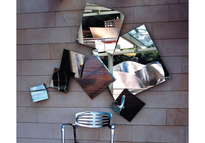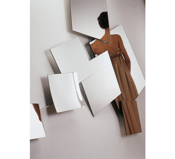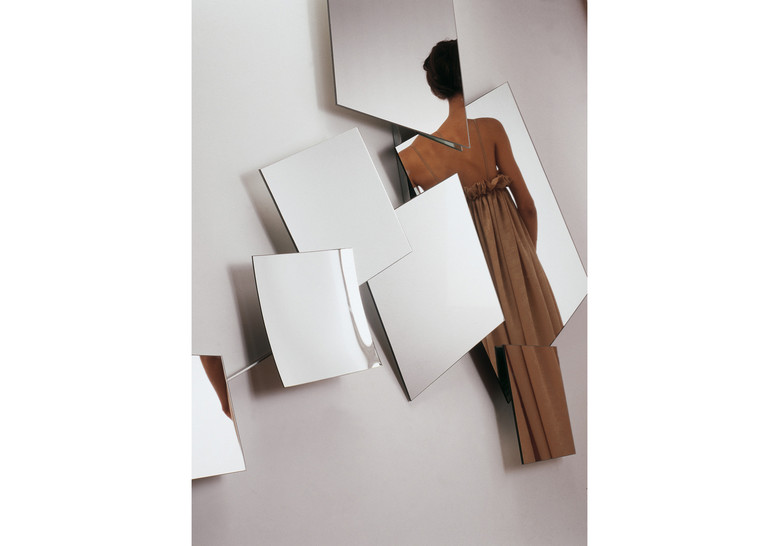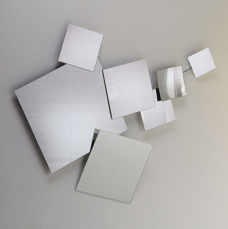 Mirror composed of 7 different square two-sided mirrors of different sizes, with variable position. The mirrors are plane with exception of the one marked H, which is concave. Structure, ferrules and discs in zinc-plated iron.