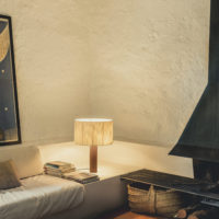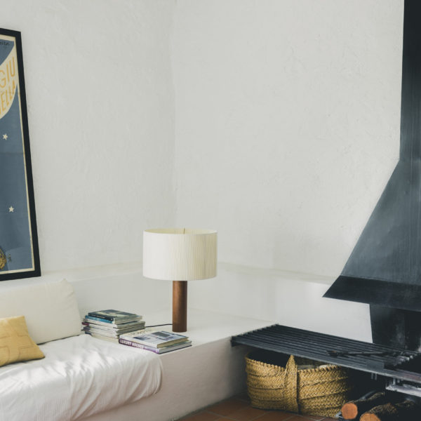 This is a table lamp with a serene exterior, the beacon of a modernity that captures the pragmatic temperament of a great Spanish pioneer. A central solid wooden column supports a generous circular shade made of bookbinding tape, whose asymmetry produces relaxing chiaroscuros. Lampshade natural cotton ribbon with silk border.Wooden leg in sapeli or oak timber.