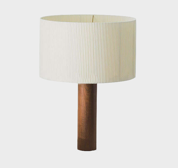 This is a table lamp with a serene exterior, the beacon of a modernity that captures the pragmatic temperament of a great Spanish pioneer. A central solid wooden column supports a generous circular shade made of bookbinding tape, whose asymmetry produces relaxing chiaroscuros. Lampshade natural cotton ribbon with silk border.Wooden leg in sapeli or oak timber.