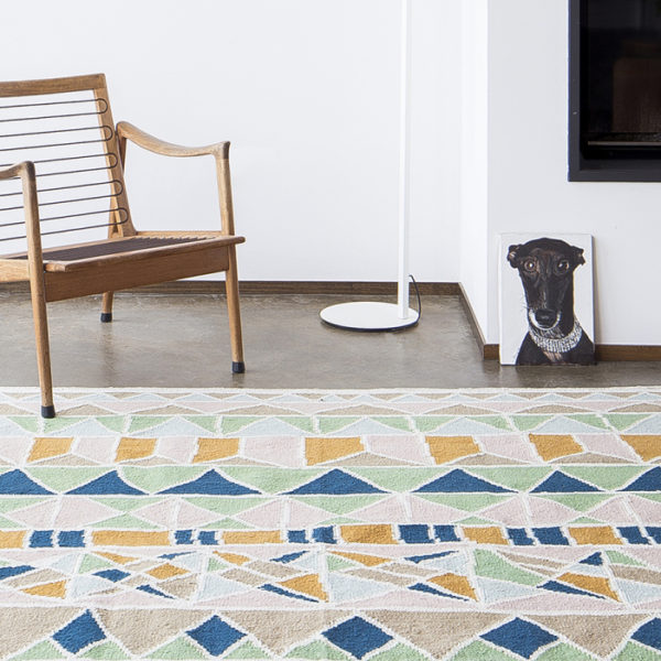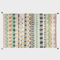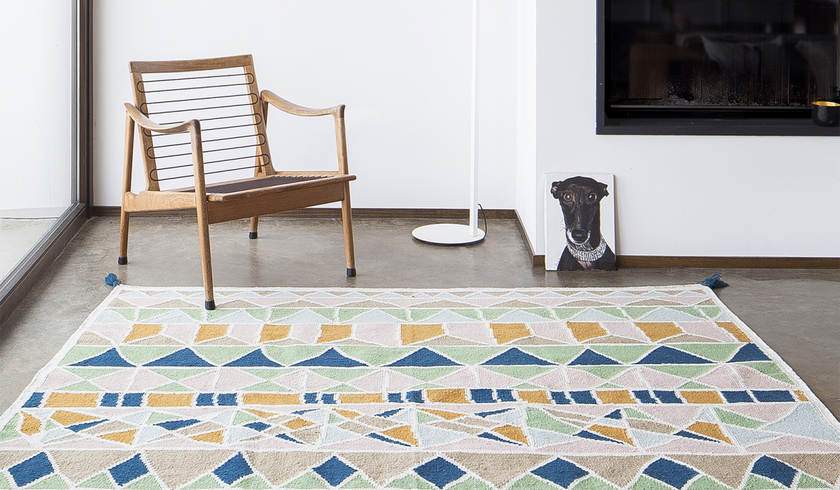 Colourful rug suitable for both indoor and outdoor. Made of recycled polyester. Kilim system.  Height: 6 mm.  Weight: 1830 gr/m²
